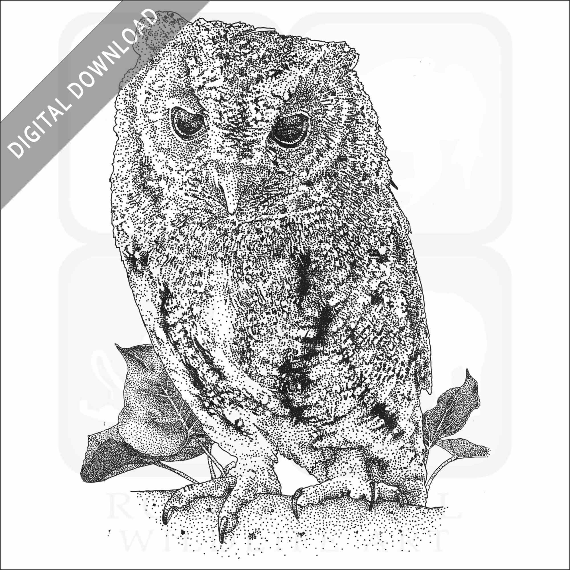 Stock art illustration of a Flammulated Owl (Psiloscops flammeolus.)Â The illustration is available in black and white or color for immediate download.