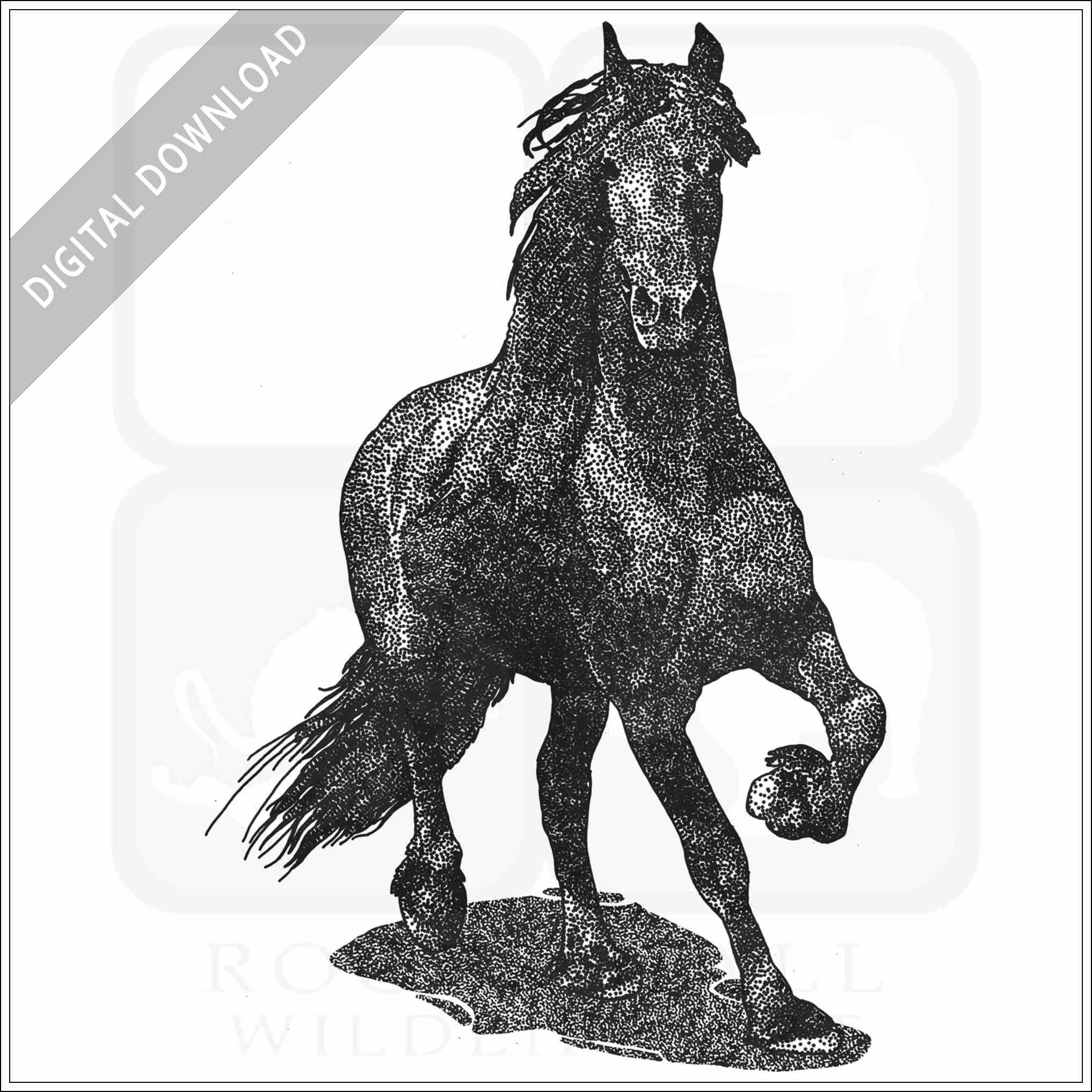 Stock art illustration of a Friesian Horse (Equus Ferus.)Â The illustration is available in black and white or color for immediate download.