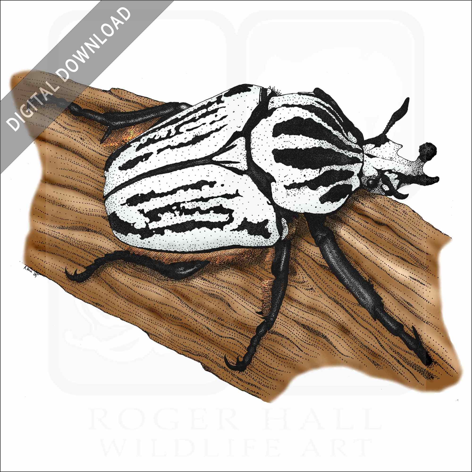 Stock art illustration of a Goliath Beetle (Goliathus orientalis.) The illustration is available in black and white or color for immediate download.