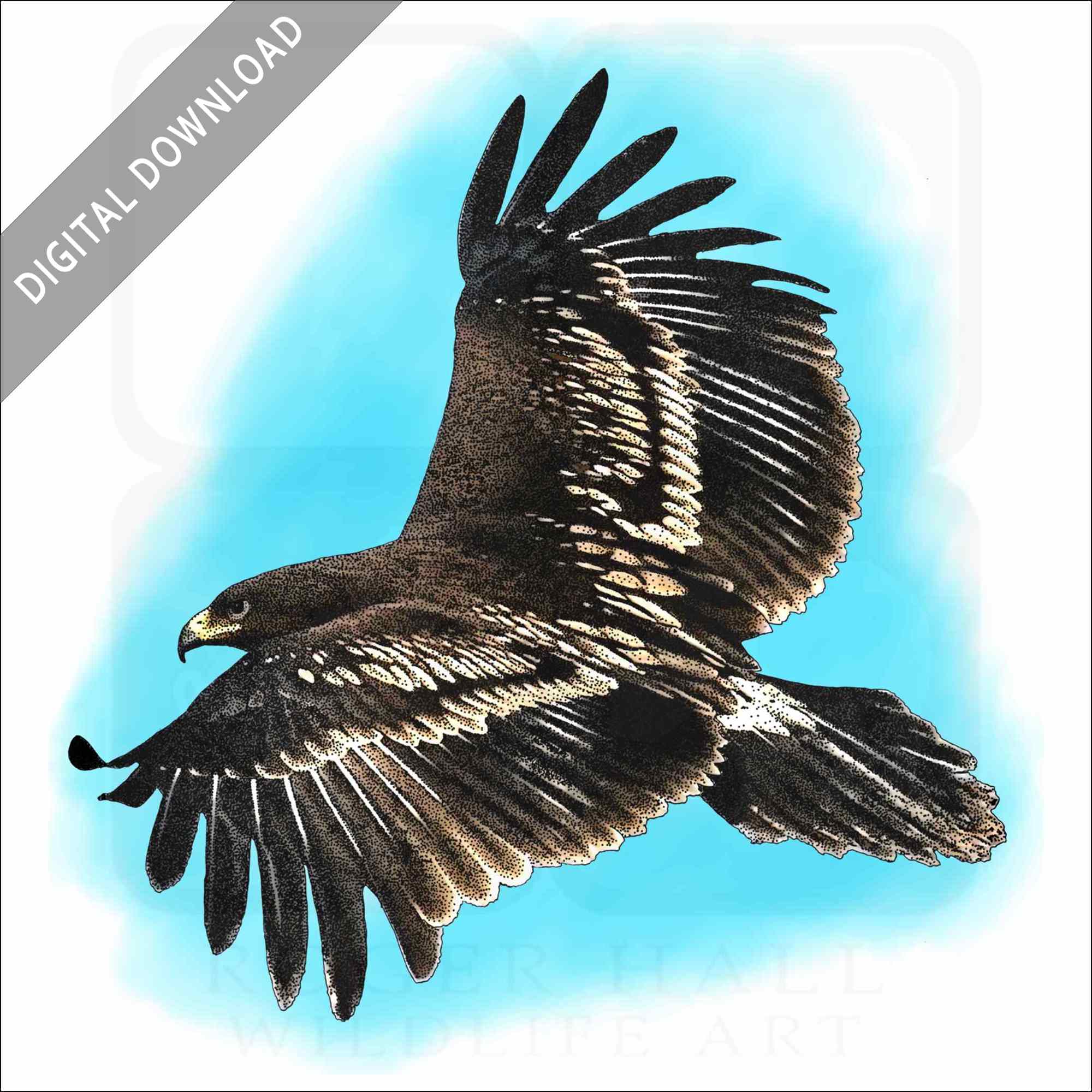 Stock art illustration of a Greater Spotted Eagle (Clanga clanga.) The illustration is available in black and white or color for immediate download.