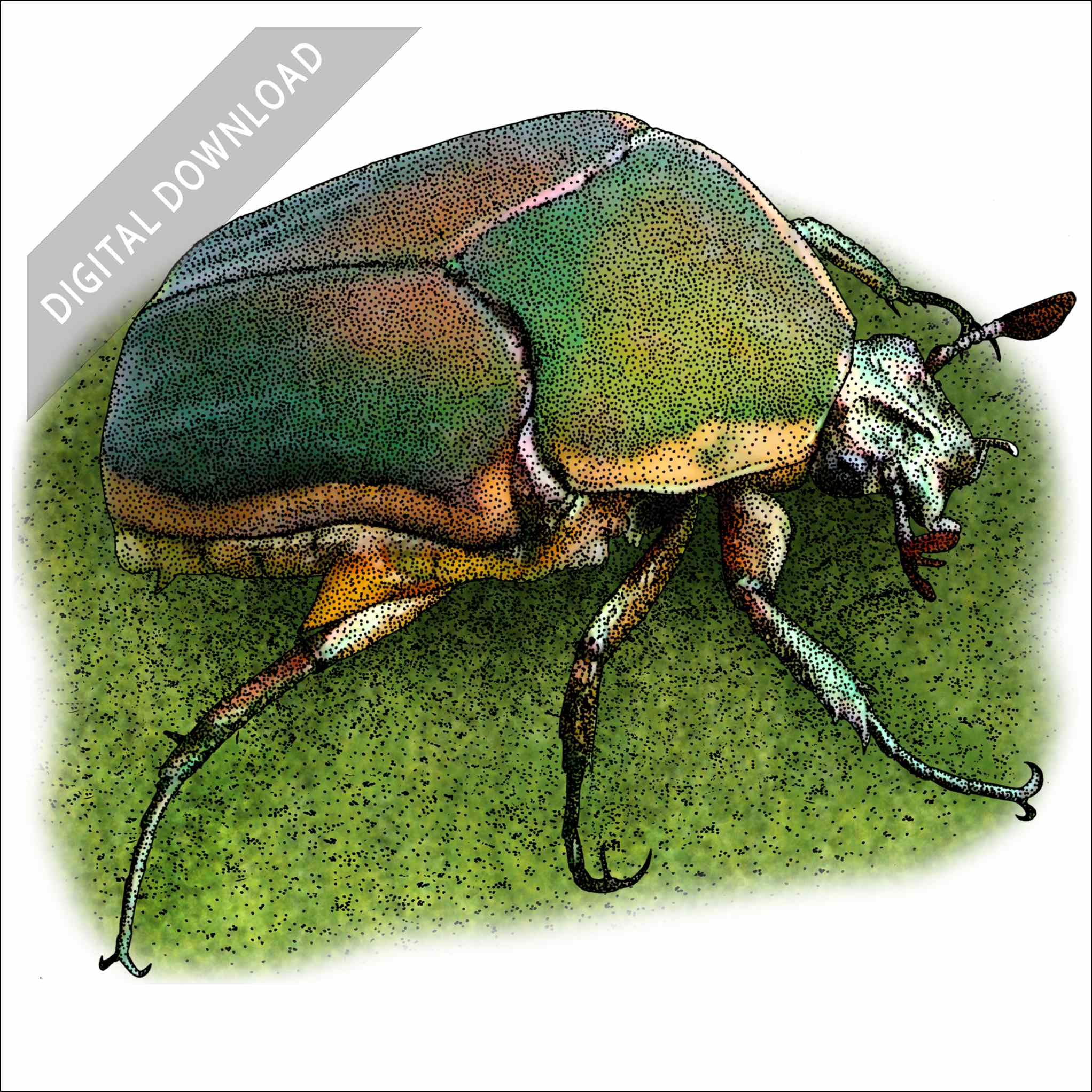 Stock art illustration of a Green June Beetle (Cotinis nitida.)Â The illustration is available in black and white or color for immediate download.