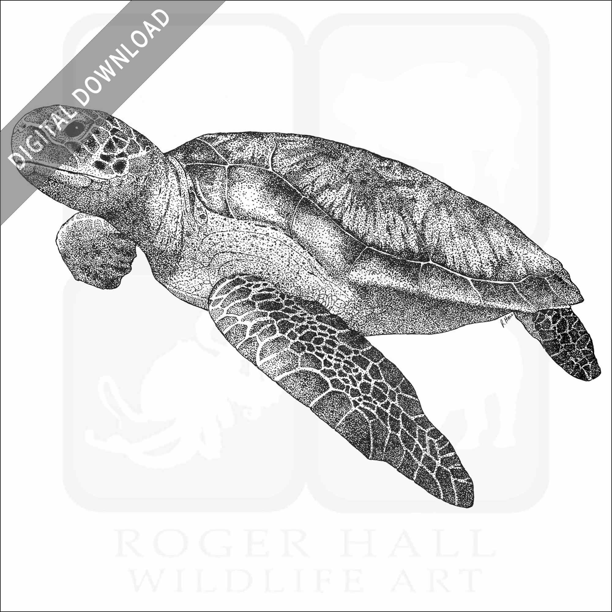Stock art illustration of a Green Sea Turtle (Chelonia mydas.) The illustration is available in black and white or color for immediate download.