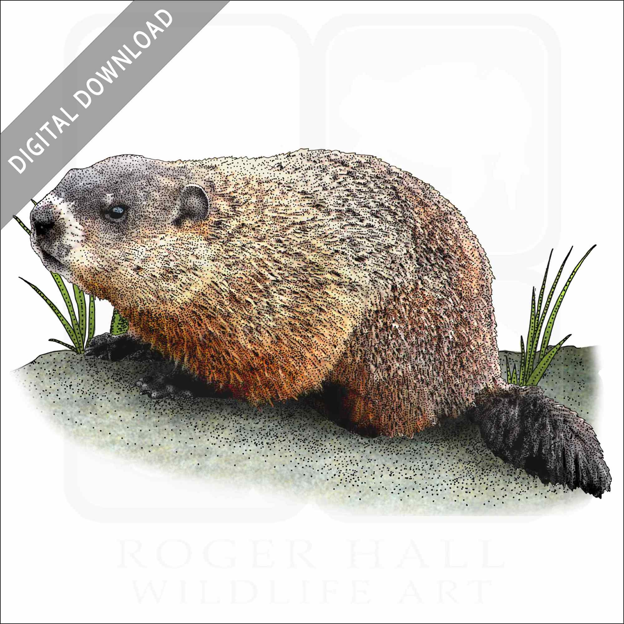 Stock art illustration of a Groundhog or Woodchuck (Marmota monax.)Â The illustration is available in black and white or color for immediate download.