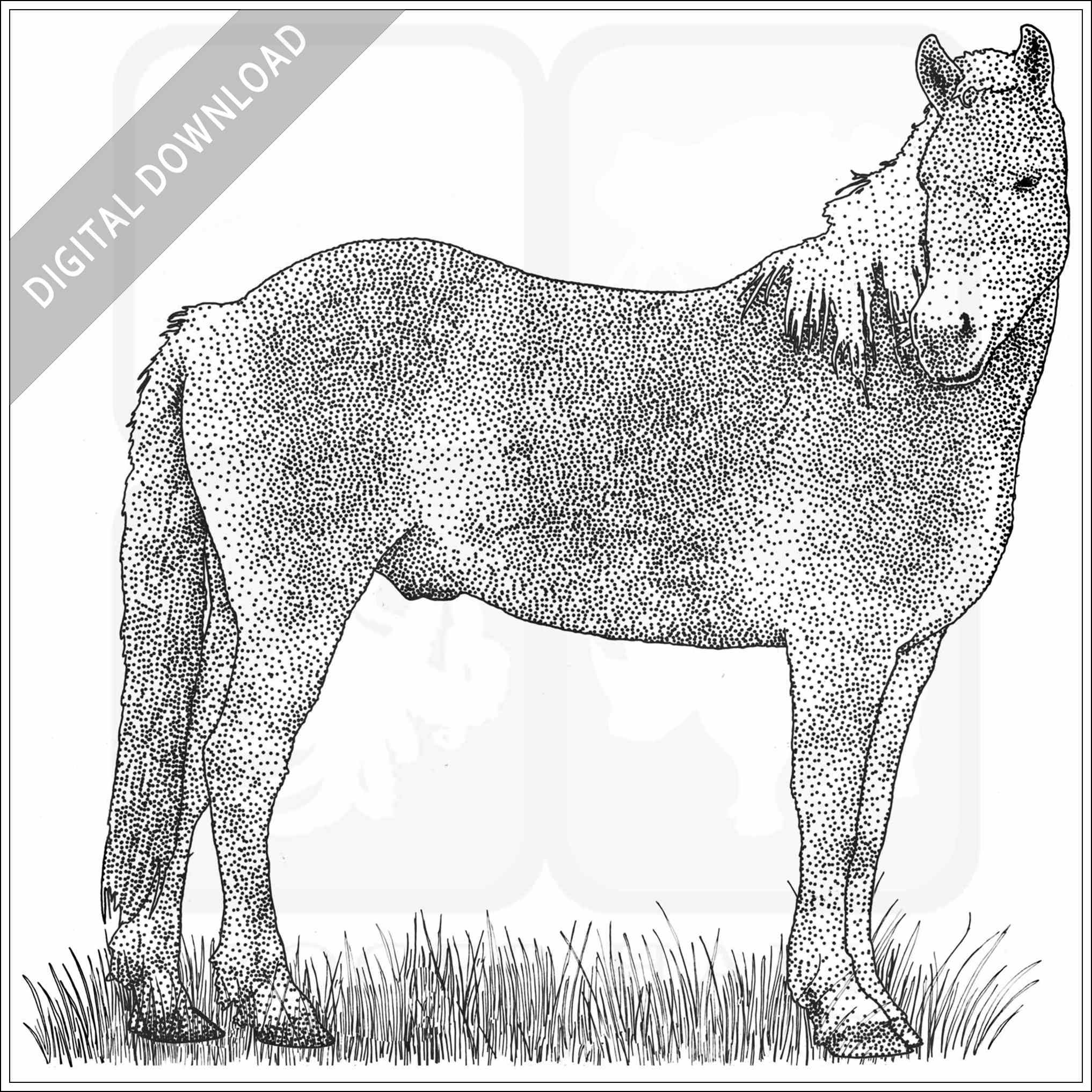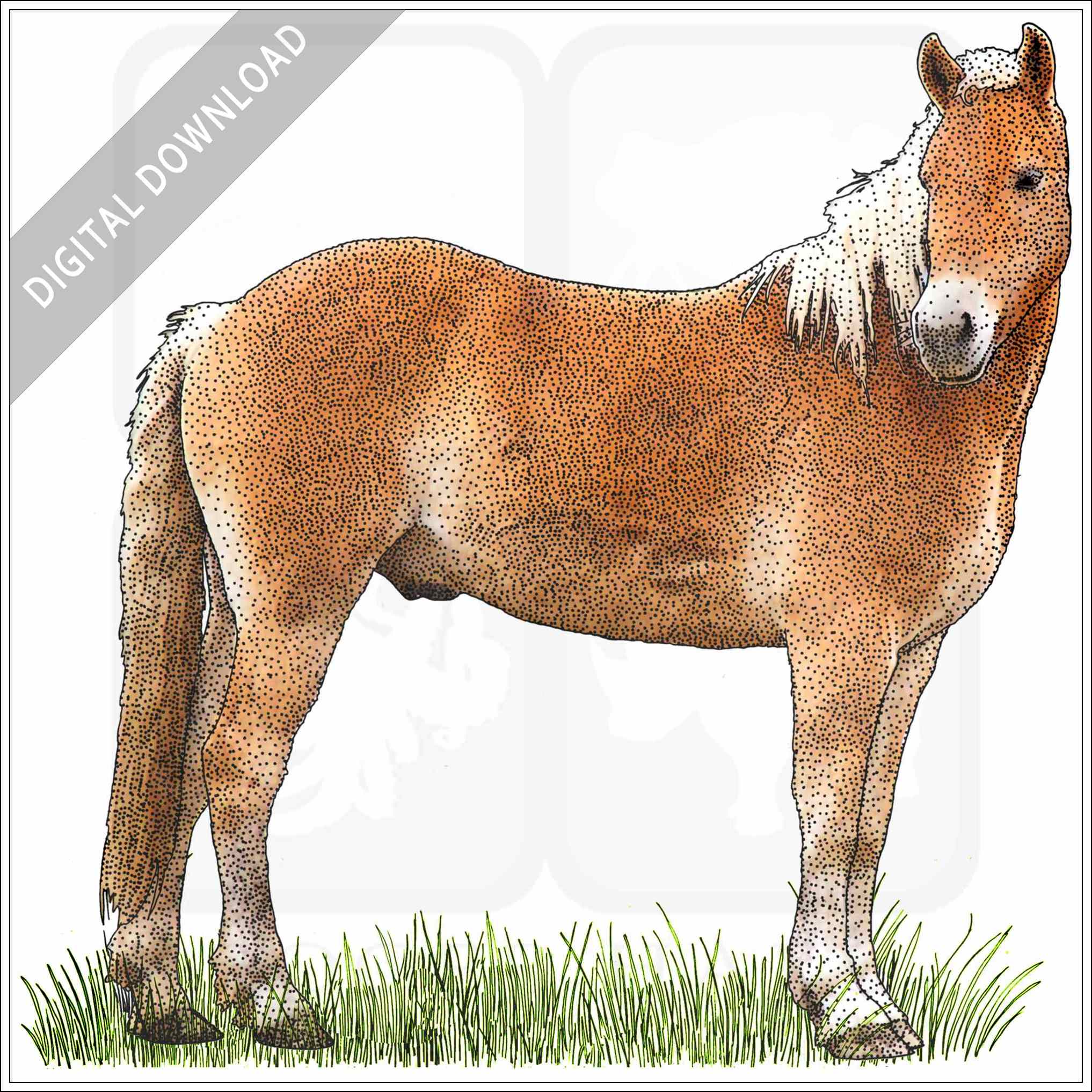 Stock art illustration of a Haflinger Horse (Equus Ferus.)Â The illustration is available in black and white or color for immediate download.