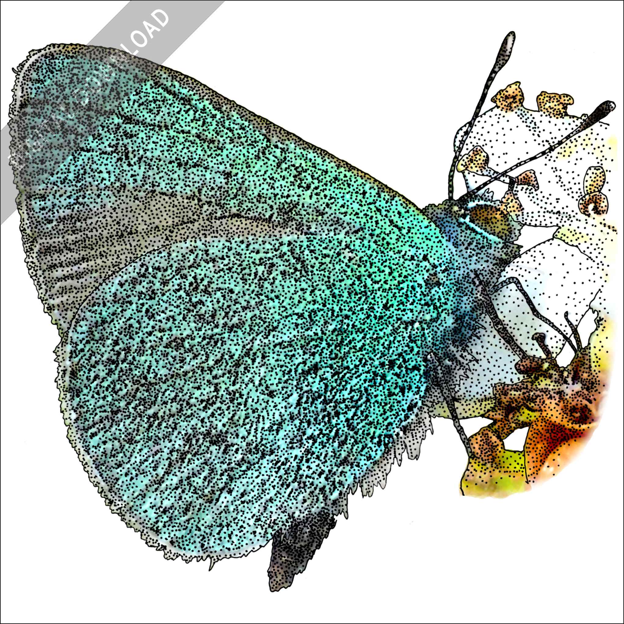 Stock art illustration of a Hawaiian Blue Butterfly (Udara blackburnii.)Â The illustration is available in black and white or color for immediate download.