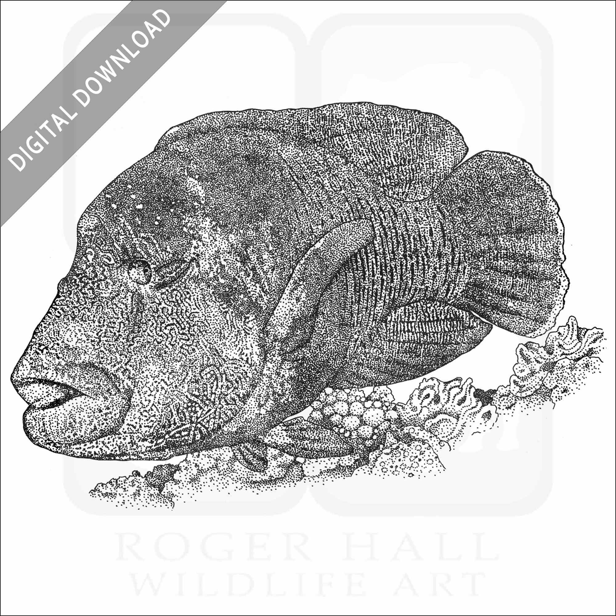 Stock art illustration of a Humphead Wrasse (Cheilinus undulatus.) The illustration is available in black and white or color for immediate download.