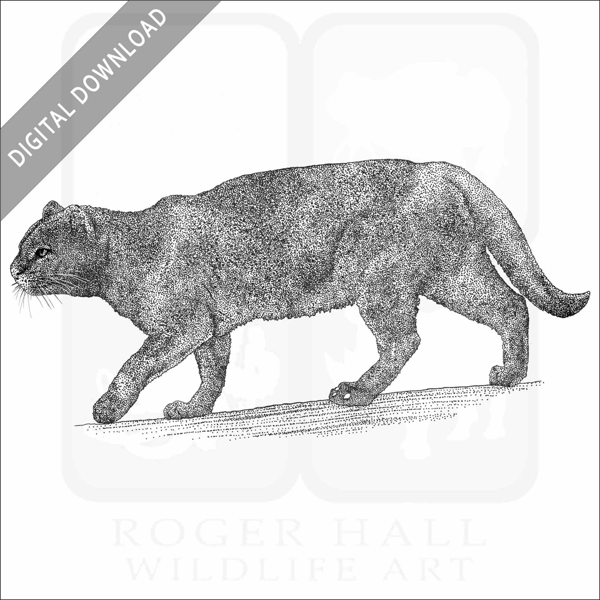 Stock art illustration of a Jaguarundi (Puma yagouaroundi.) The illustration is available in black and white or color for immediate download.
