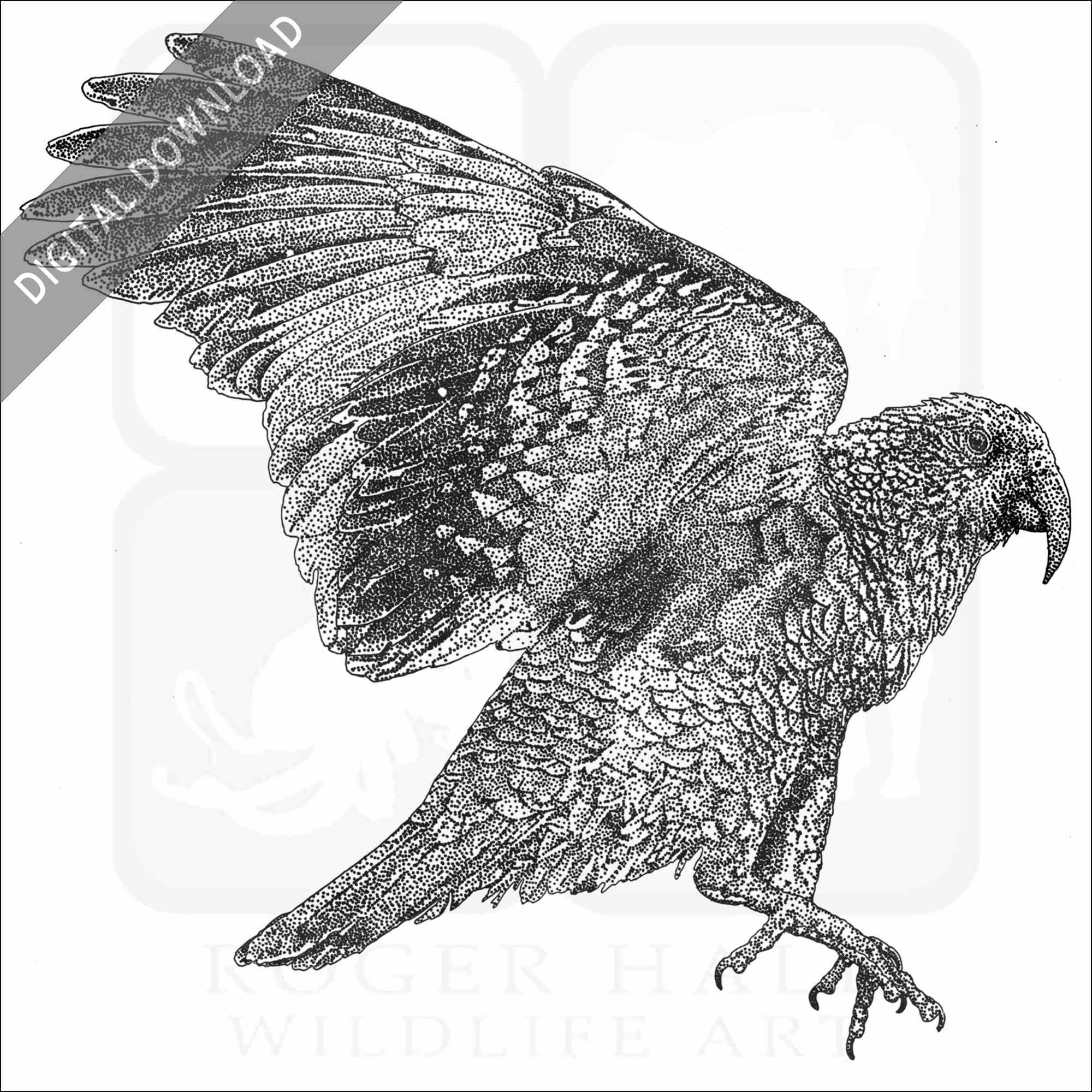 Stock art illustration of a Kea (Nestor notabilis.)Â The illustration is available in black and white or color for immediate download.