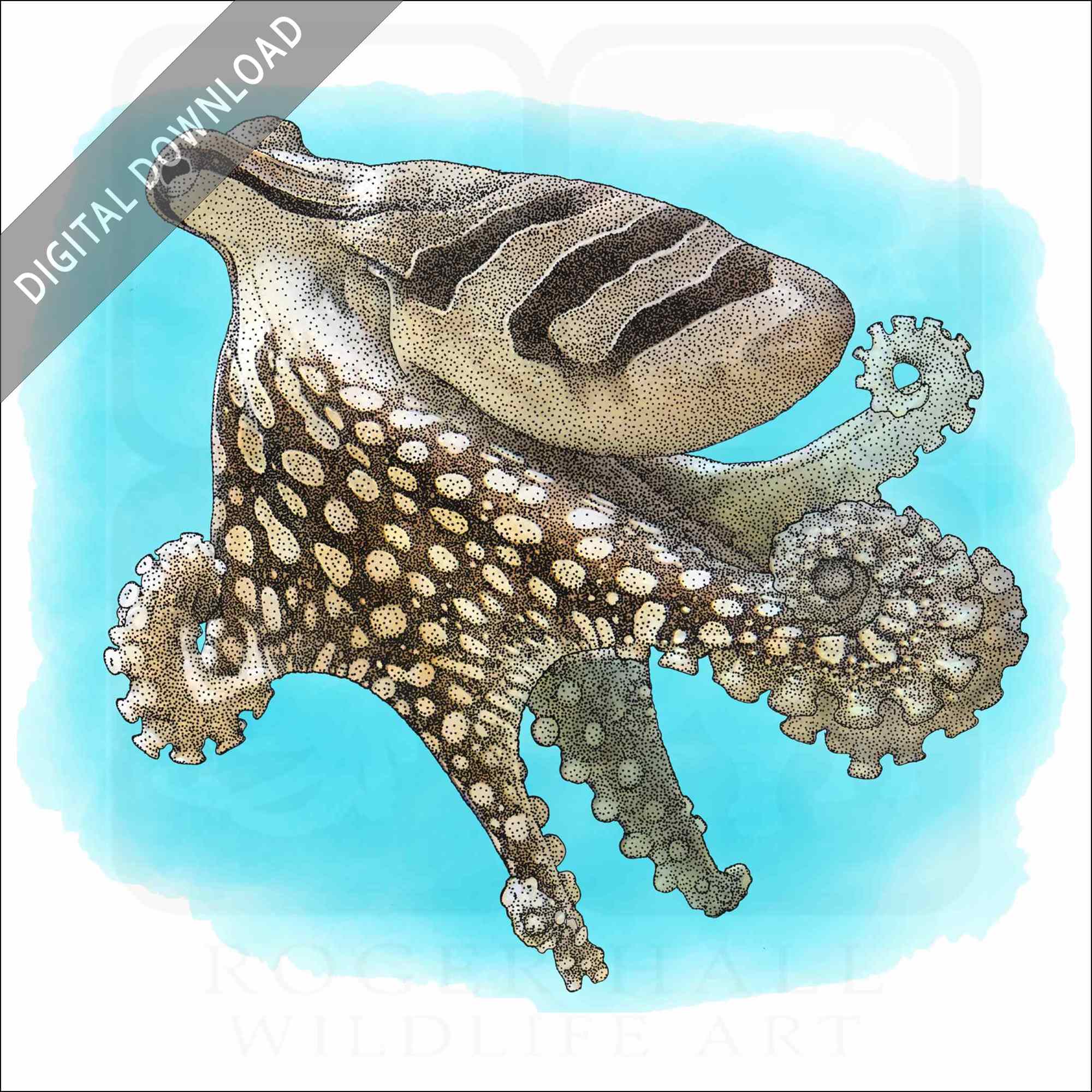 Stock art illustration of a Larger Pacific Striped Octopus (Octopus sp.) The illustration is available in black and white or color for immediate download.