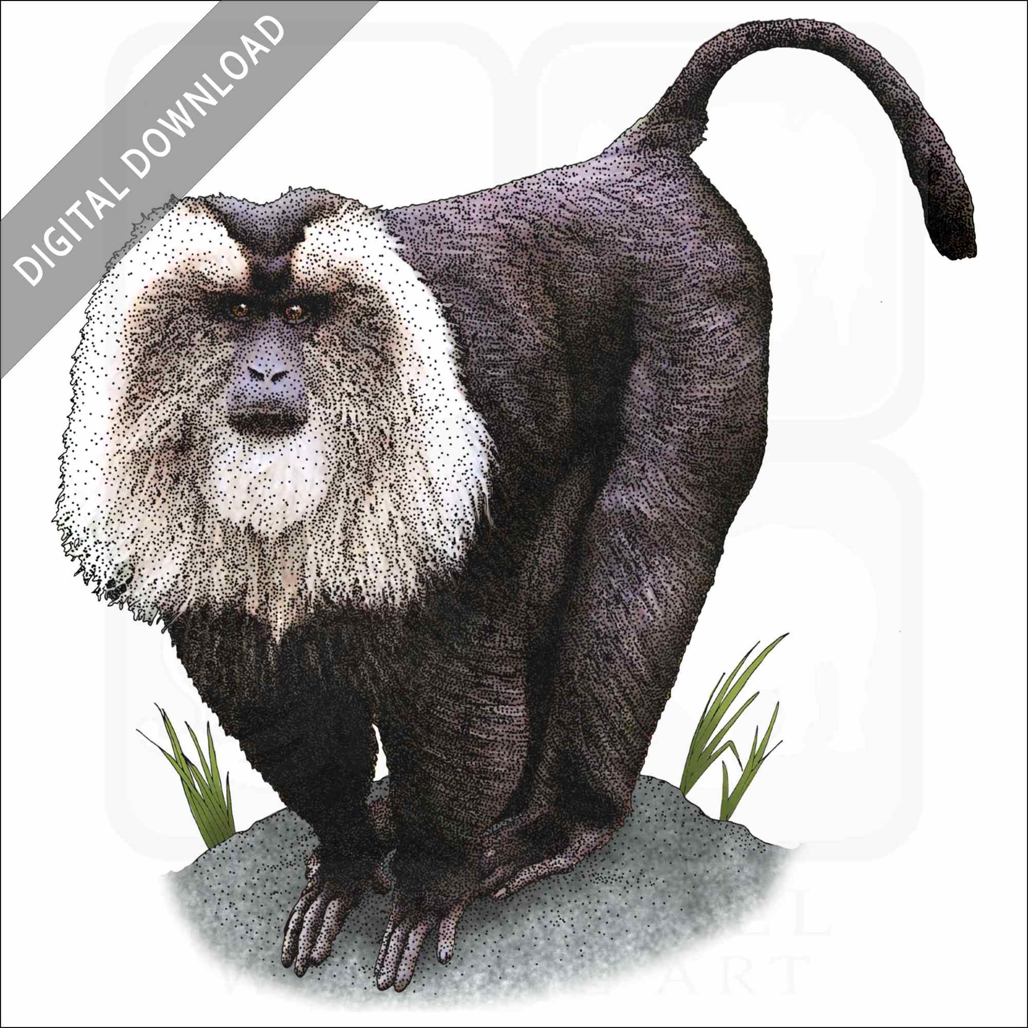 Stock art illustration of a Lion-Tailed Macaque (Macaca silenus.) The illustration is available in black and white or color for immediate download
