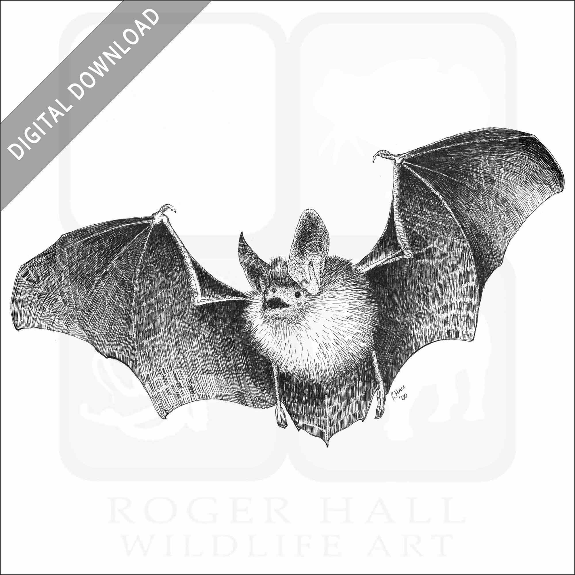 Stock art illustration of a Long-Eared Bat (Myotis evotis.) The illustration is available in black and white or color for immediate download.