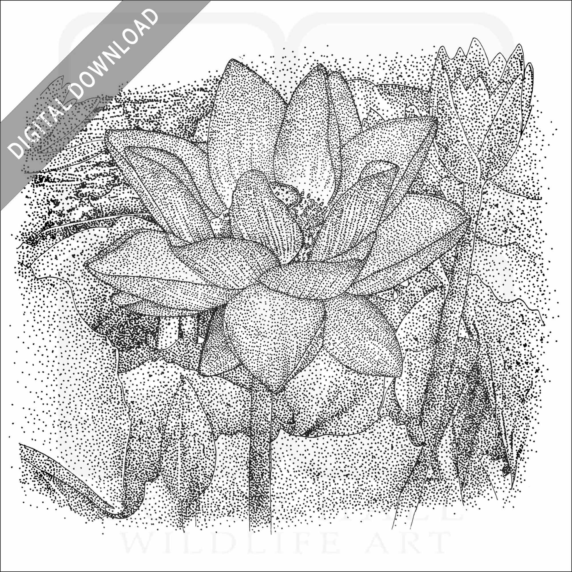 Stock art illustration of a Lotus Flower Plant (Nelumbo nucifera.)Â The illustration is available in black and white or color for immediate download.