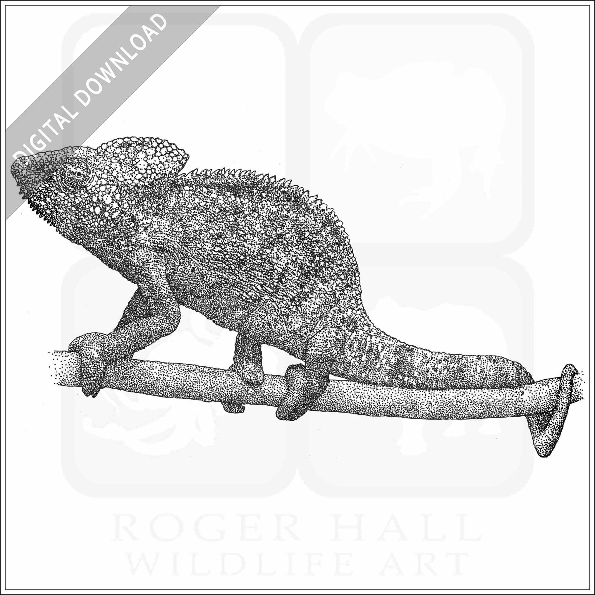 Stock art illustration of a Malagasy Giant Chameleon (Furcifer oustaleti.) The illustration is available in black and white or color for immediate download.