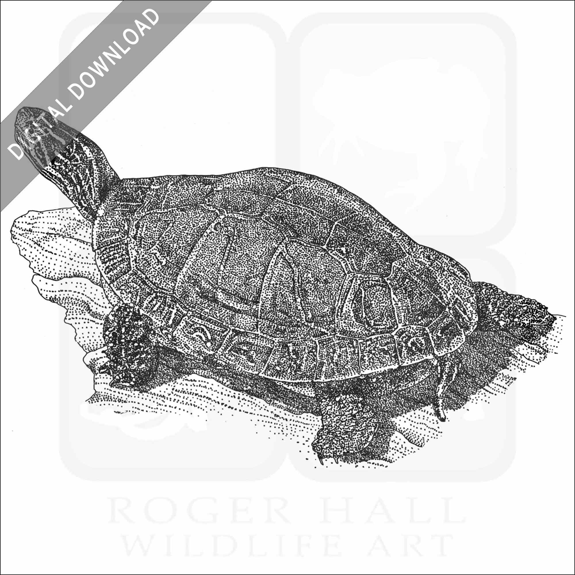 Stock art illustration of a Midland Painted Turtle (Chrysemys picta marginata.)Â The illustration is available in black and white or color for immediate download.