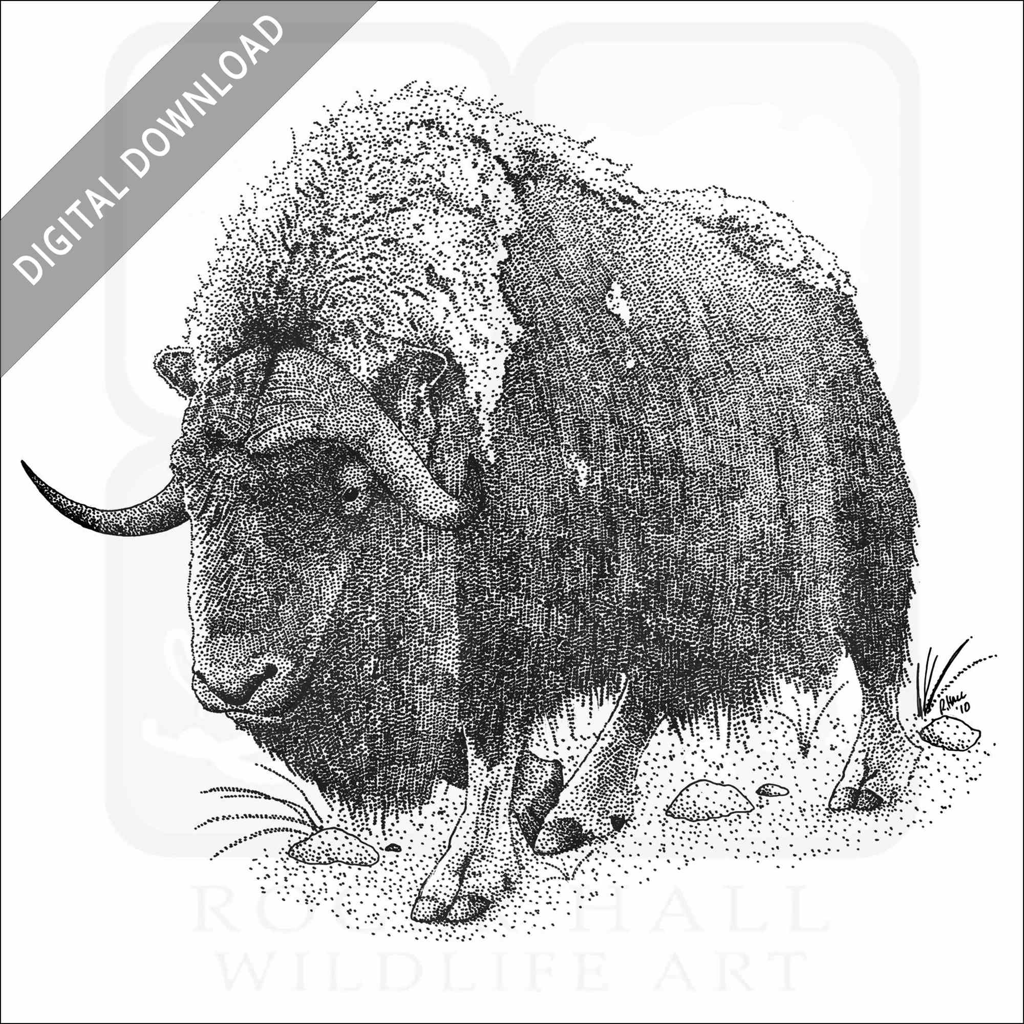 Stock art illustration of a Musk Ox (Ovibos moschatus.) The illustration is available in black and white or color for immediate download.