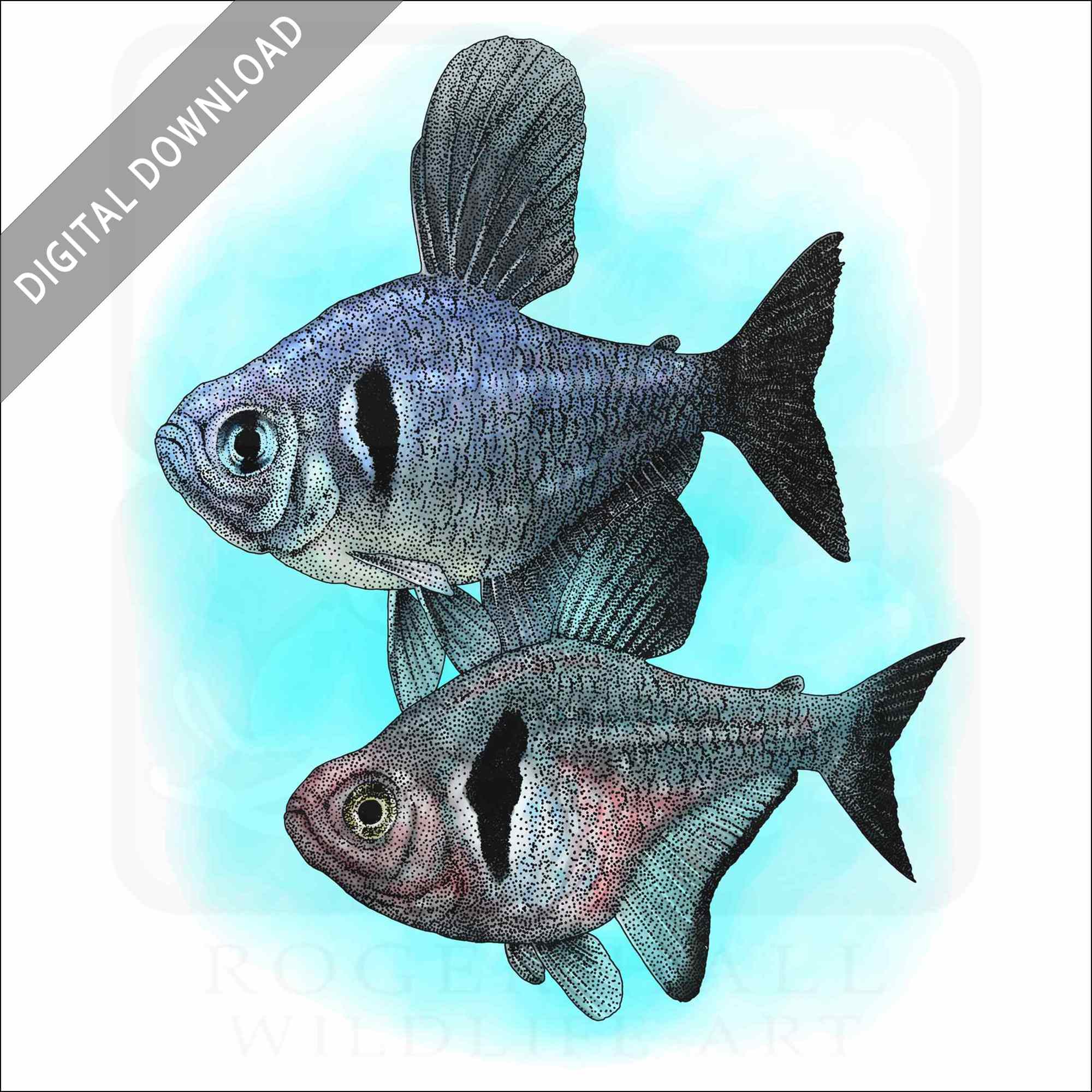 Stock art illustration of a pair of Black Phantom Tetras (Hyphessobrycon megalopterus). The illustration is available in black and white or color for immediate download.