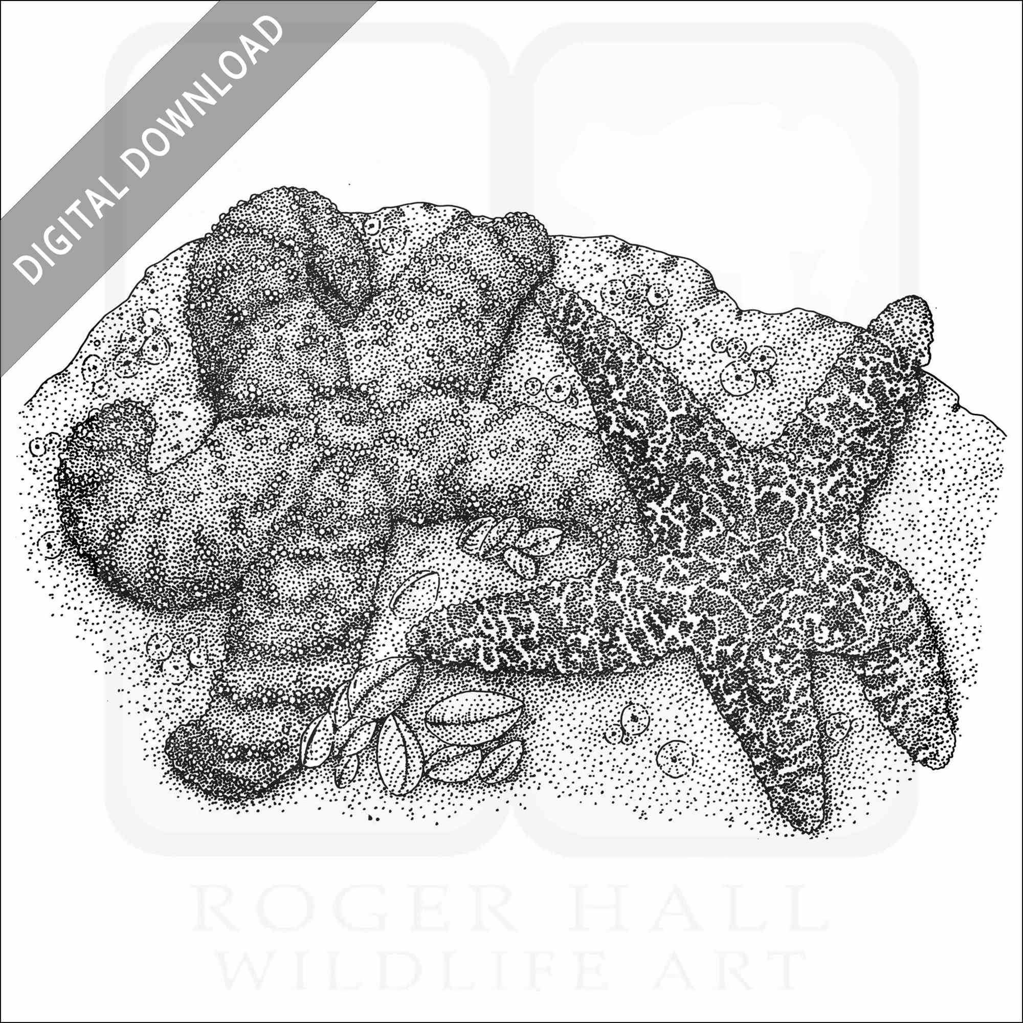 Stock art illustration of a pair of Ochre Sea Stars (Pisaster ochraceus.)Â The illustration is available in black and white or color for immediate download.