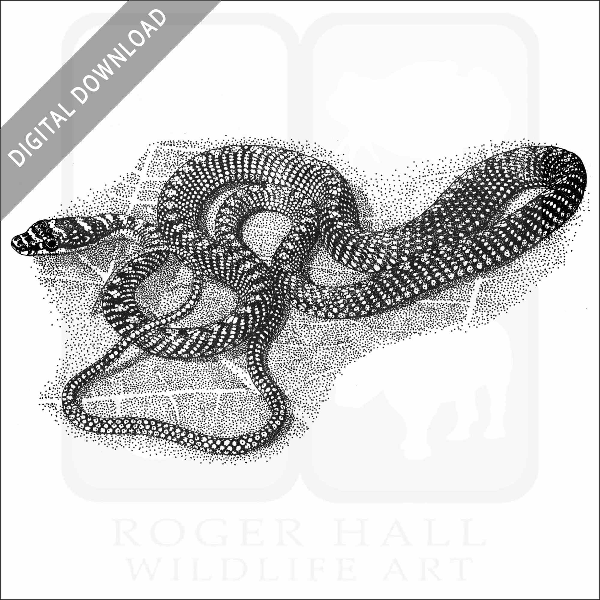 Stock art illustration of a Paradise Tree Snake (Chrysopelea paradisi.) The illustration is available in black and white or color for immediate download.