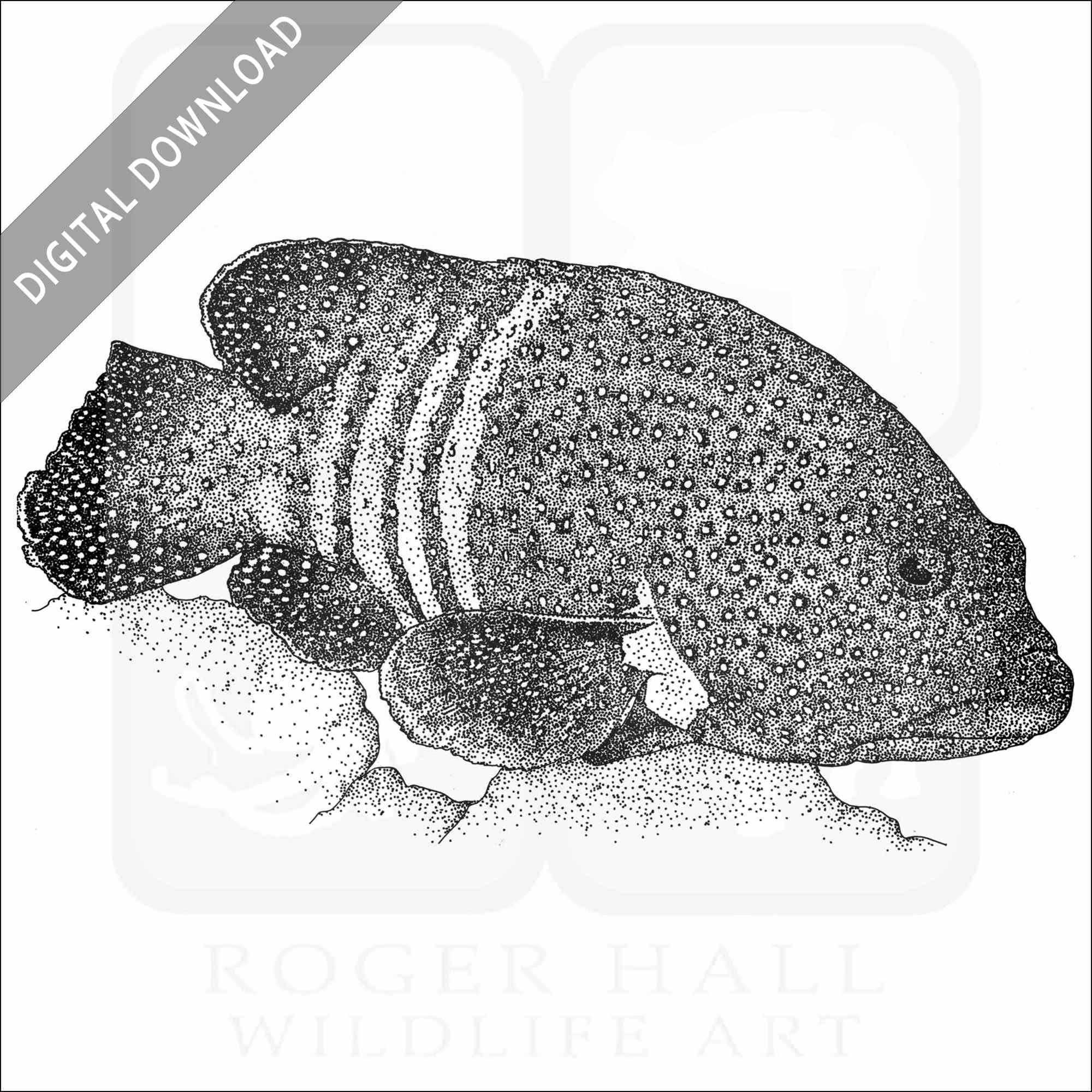 Stock art illustration of a Peacock Grouper (Cephalopholis argus.) The illustration is available in black and white or color for immediate download.