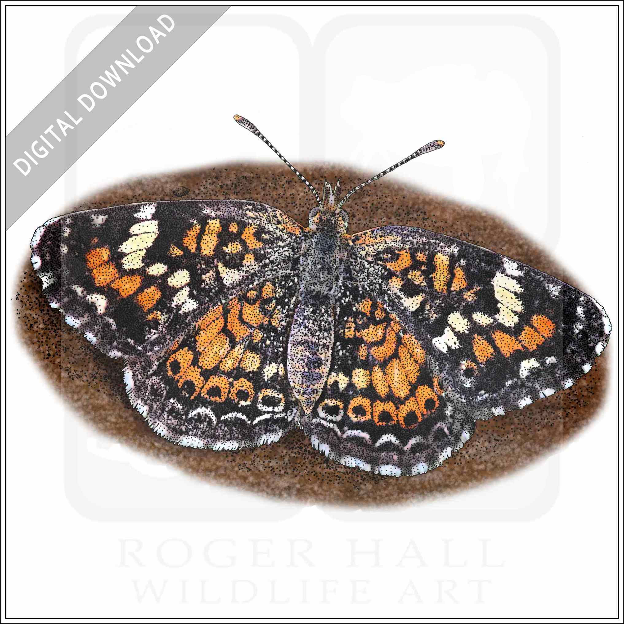 Stock art illustration of a Phaon Crescent Butterfly (Phyciodes phaon.)Â The illustration is available in black and white or color for immediate download.