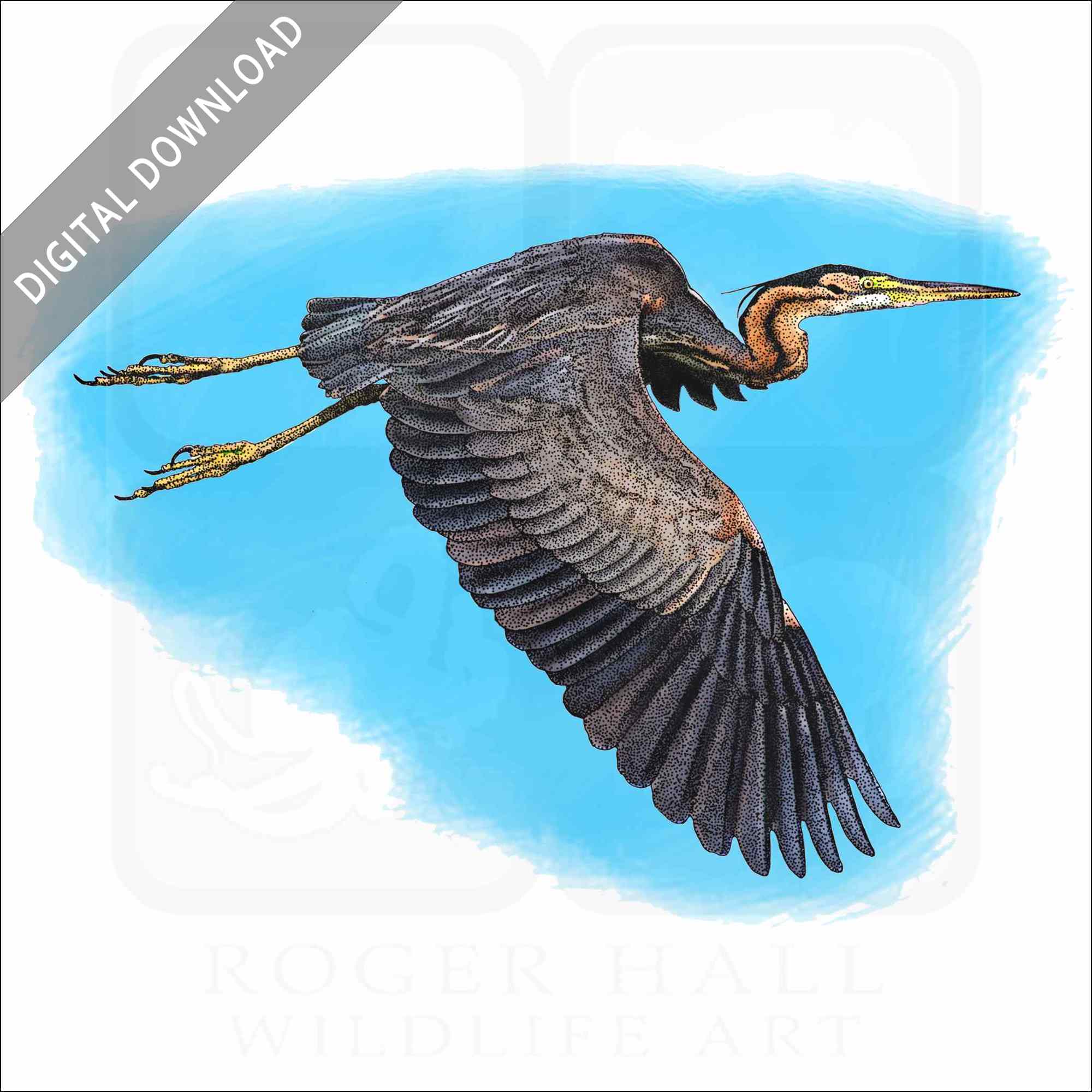 Stock art illustration of a Purple Heron (Ardea purpurea.) The illustration is available in black and white or color for immediate download.