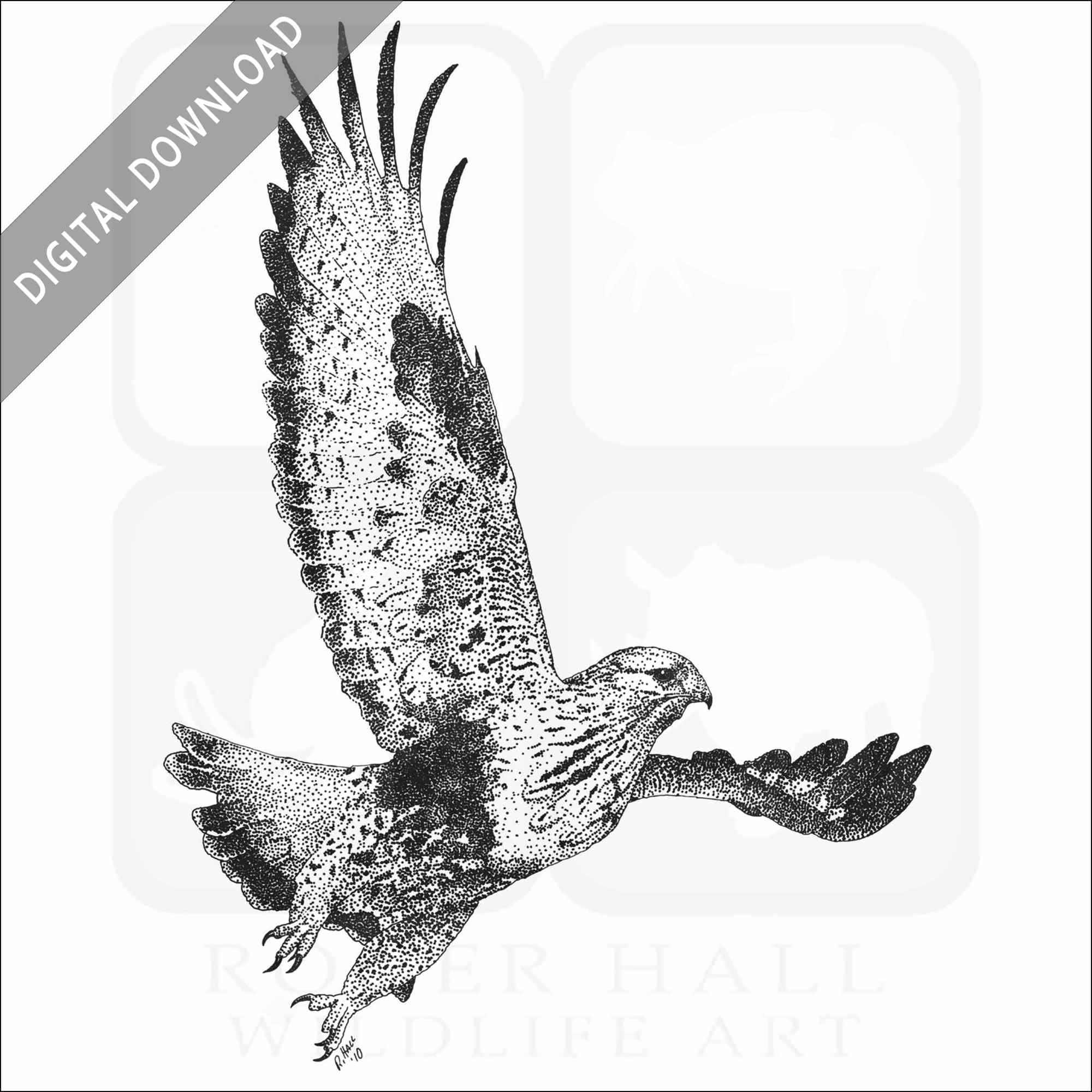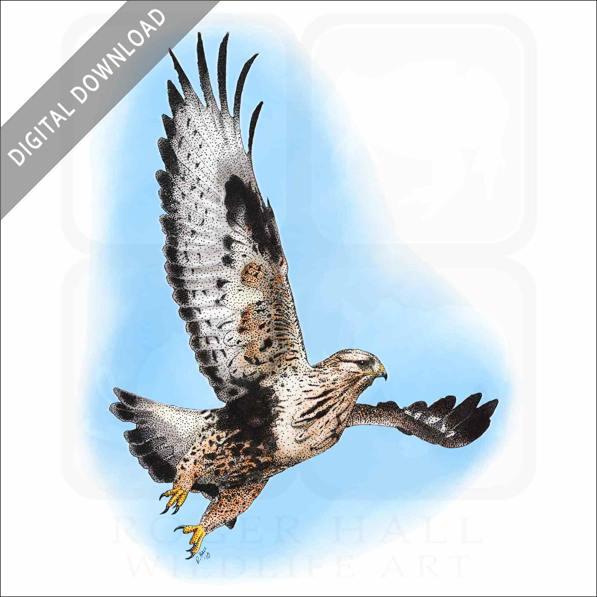 Stock art illustration of a Rough-Legged Hawk (Buteo lagopus.) The illustration is available in black and white or color for immediate download.