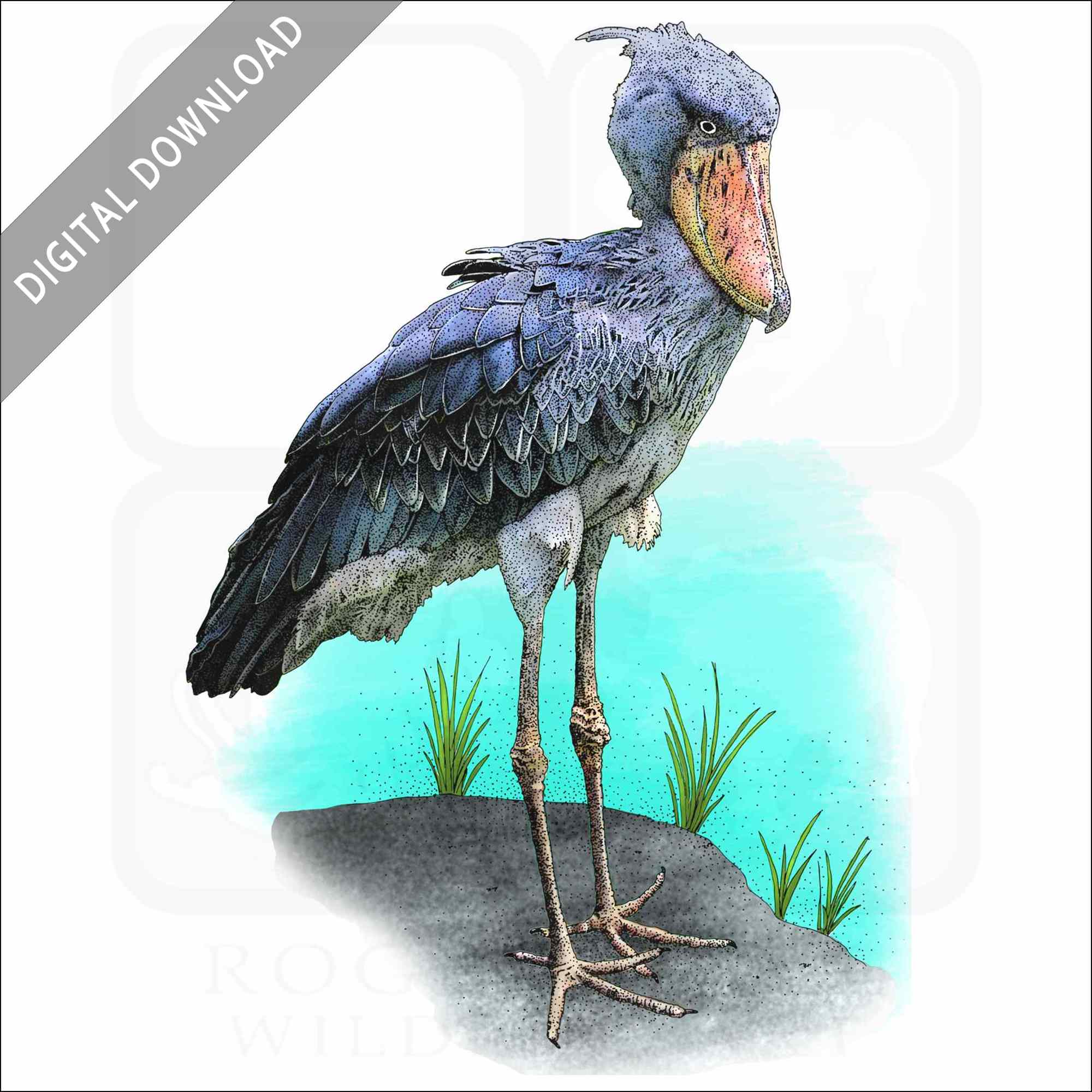 Stock art illustration of a Shoebill (Balaeniceps rex.)Â The illustration is available in black and white or color for immediate download.