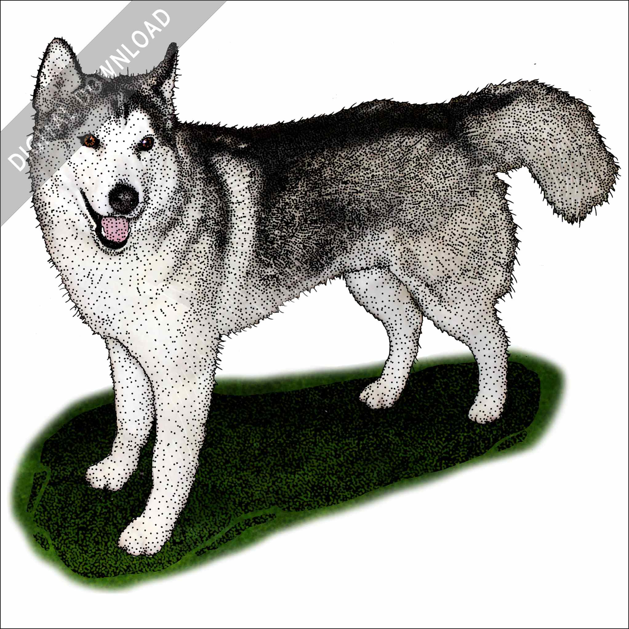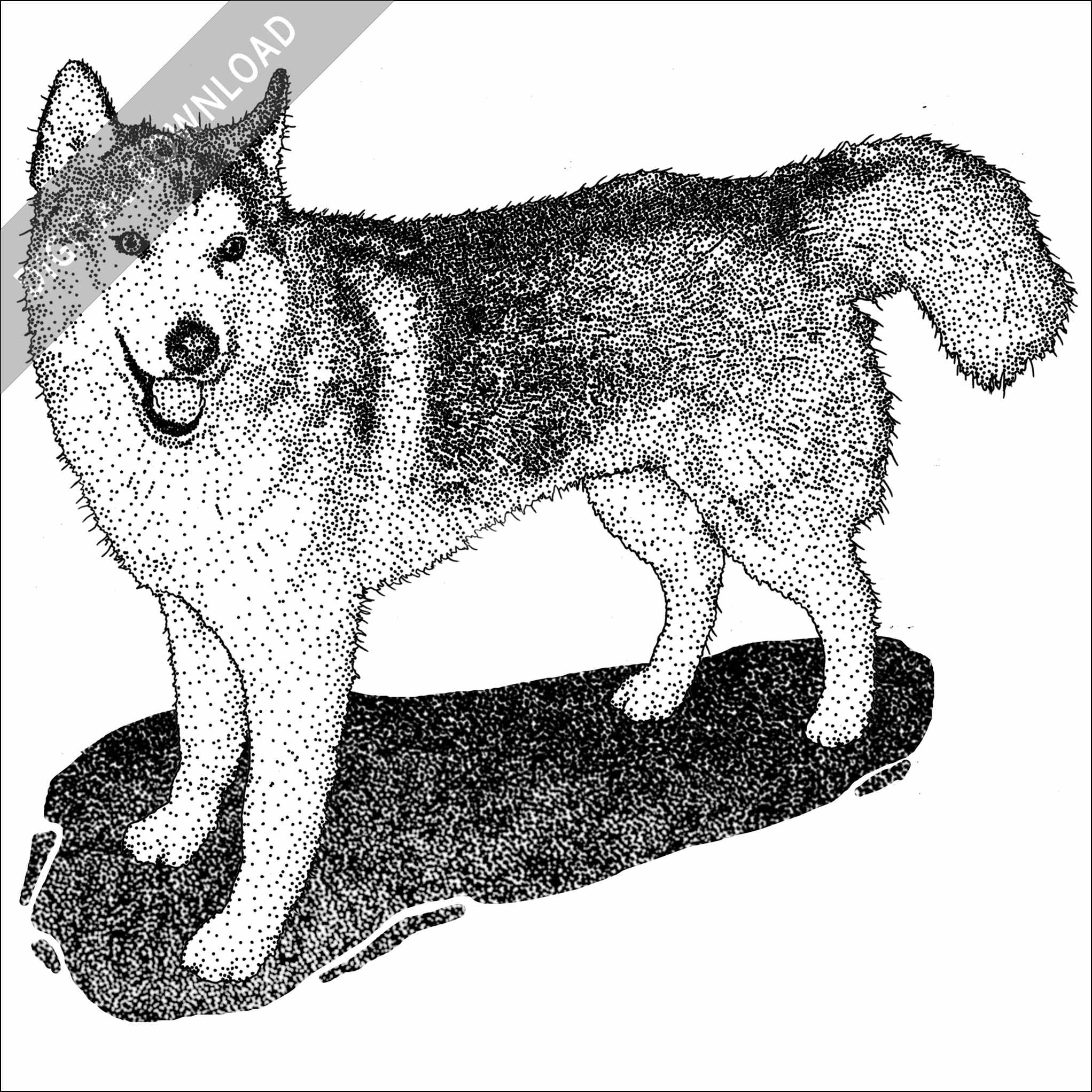 Stock art illustration of a Siberian Husky (Canis lupus familiaris.)Â The illustration is available in black and white or color for immediate download.