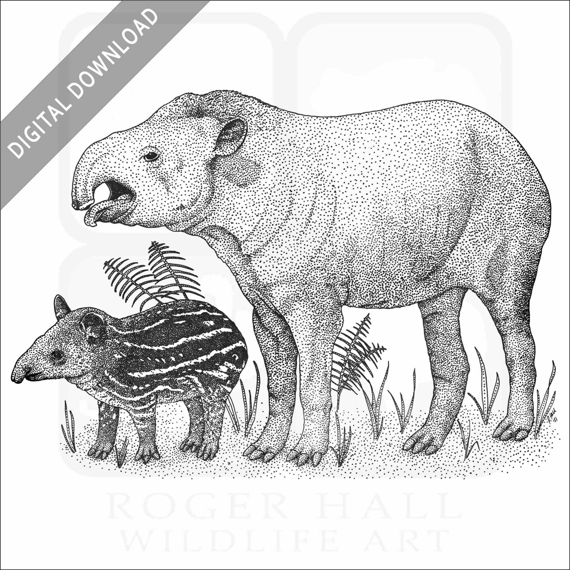 Stock art illustration of a South American Tapir and young (Tapirus terrestris.)Â The illustration is available in black and white or color for immediate download.
