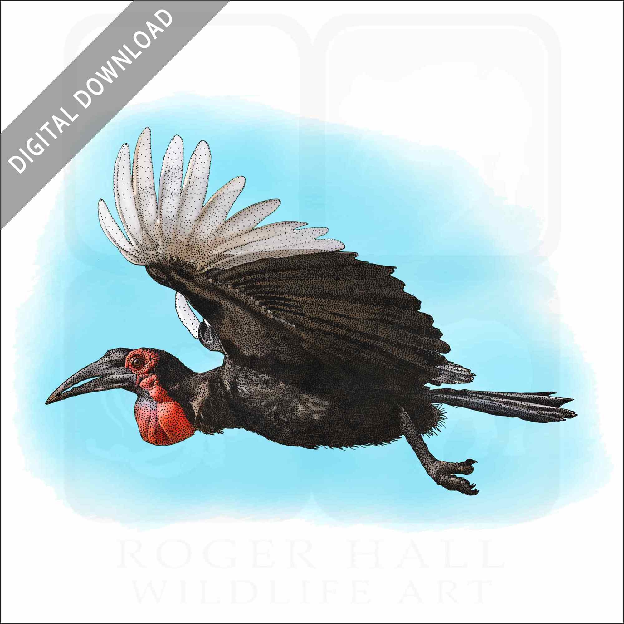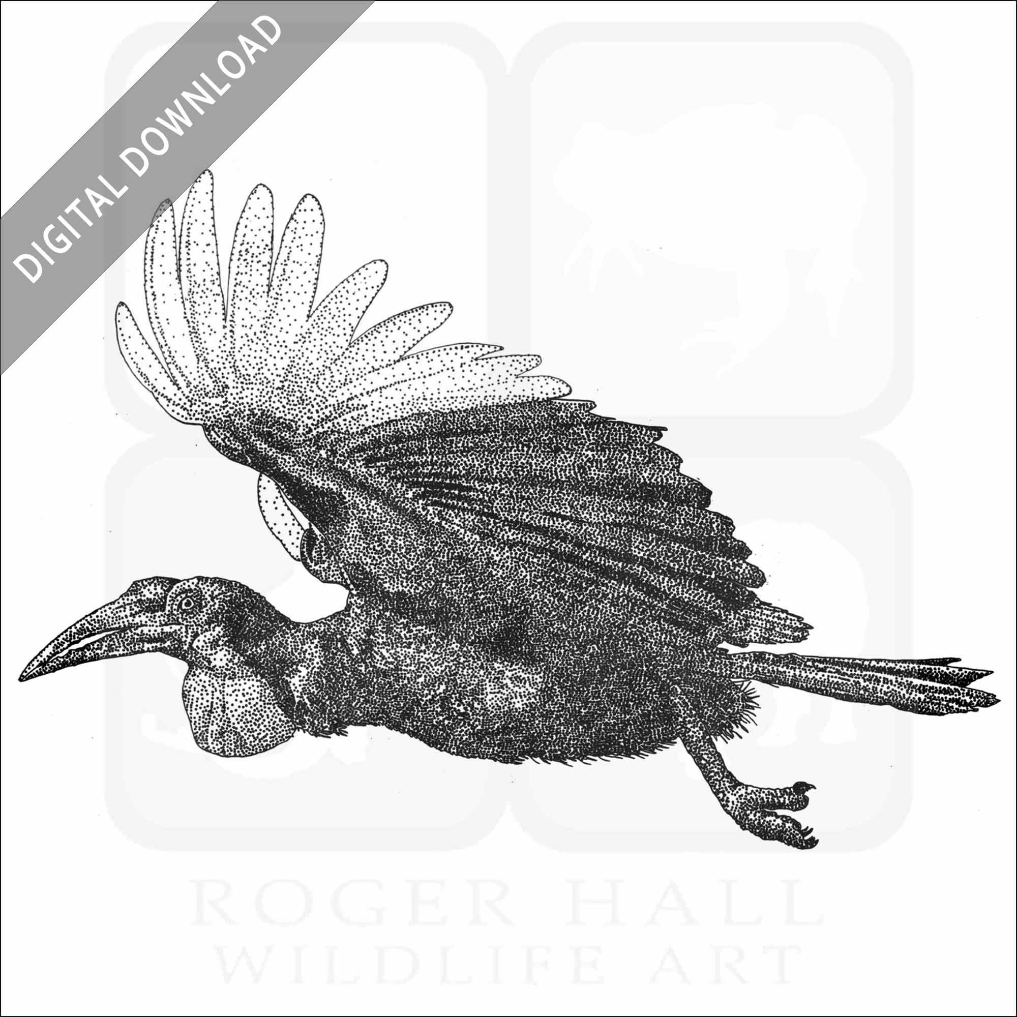 Stock art illustration of a Southern Ground Hornbill (Buceros hydrocorax.)Â The illustration is available in black and white or color for immediate download.