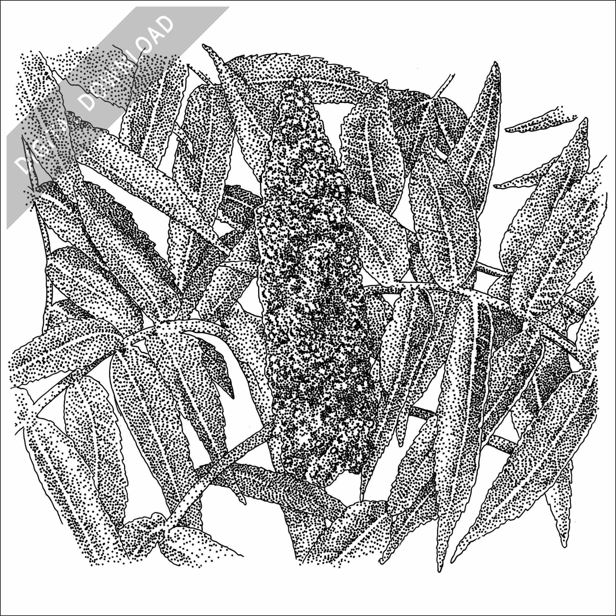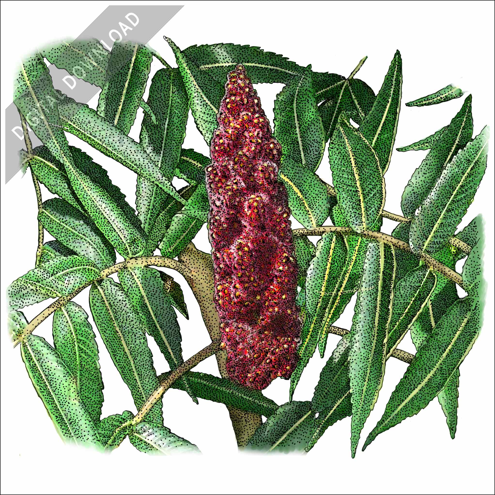 Stock art illustration of Staghorn Sumac (Rhus typhina.)Â The illustration is available in black and white or color for immediate download.