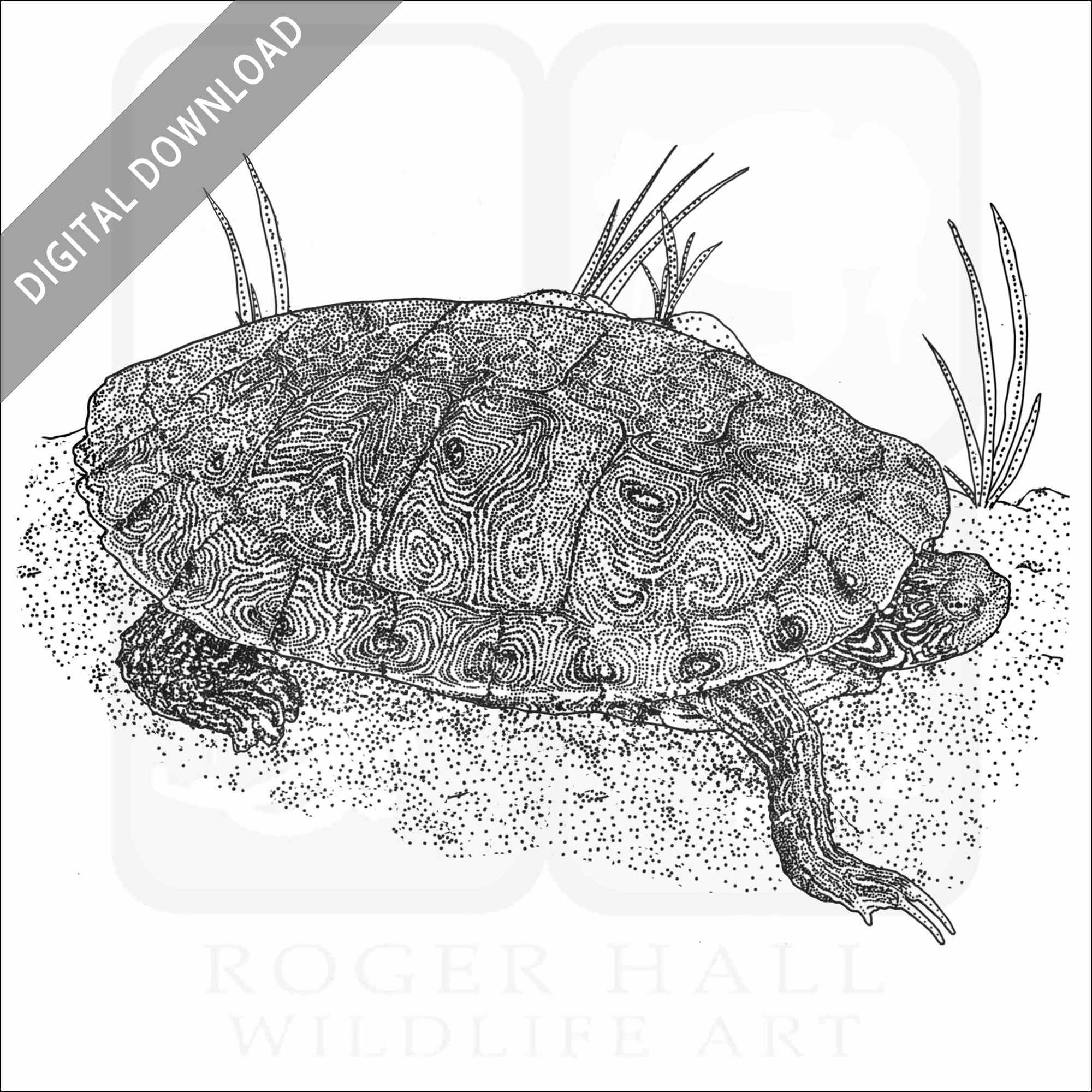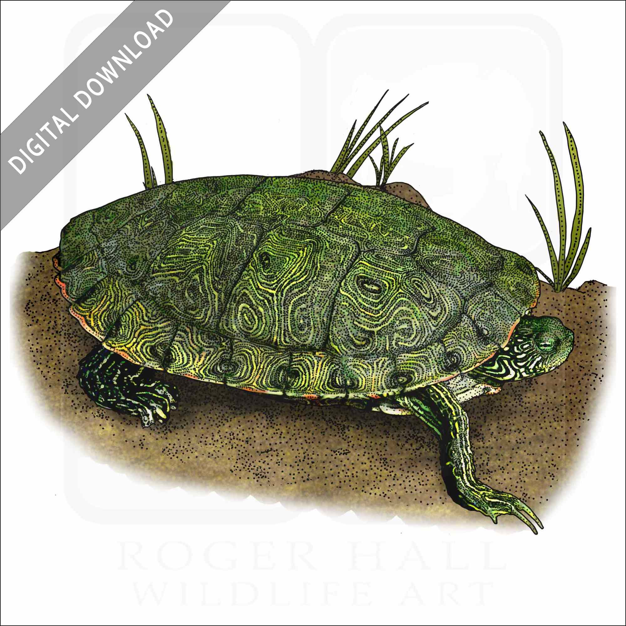 Stock art illustration of a Texas River Cooter (Pseudemys texana.) The illustration is available in black and white or color for immediate download.