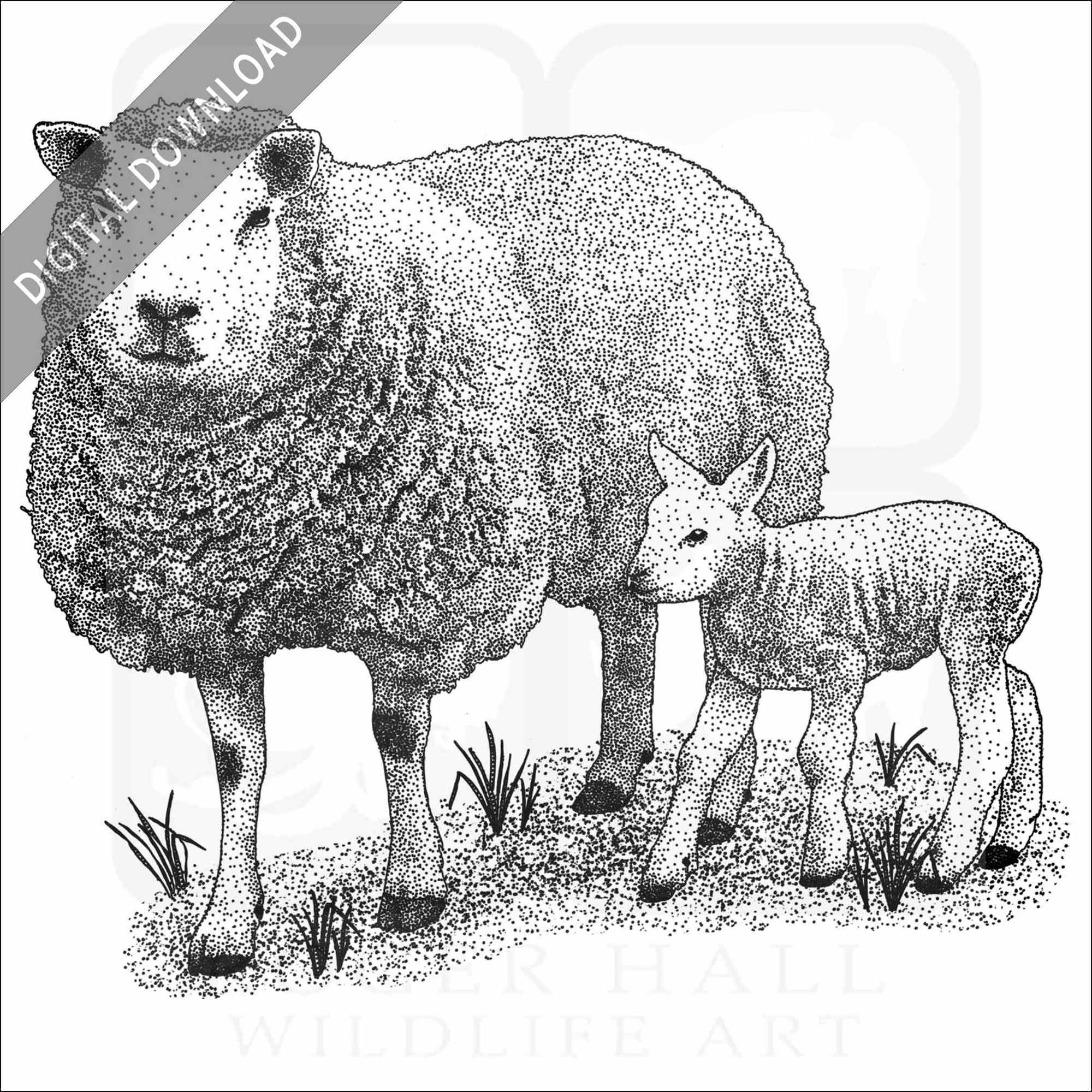 Stock art illustration of a Texel Sheep (Ovis aries.) The illustration is available in black and white or color for immediate download.
