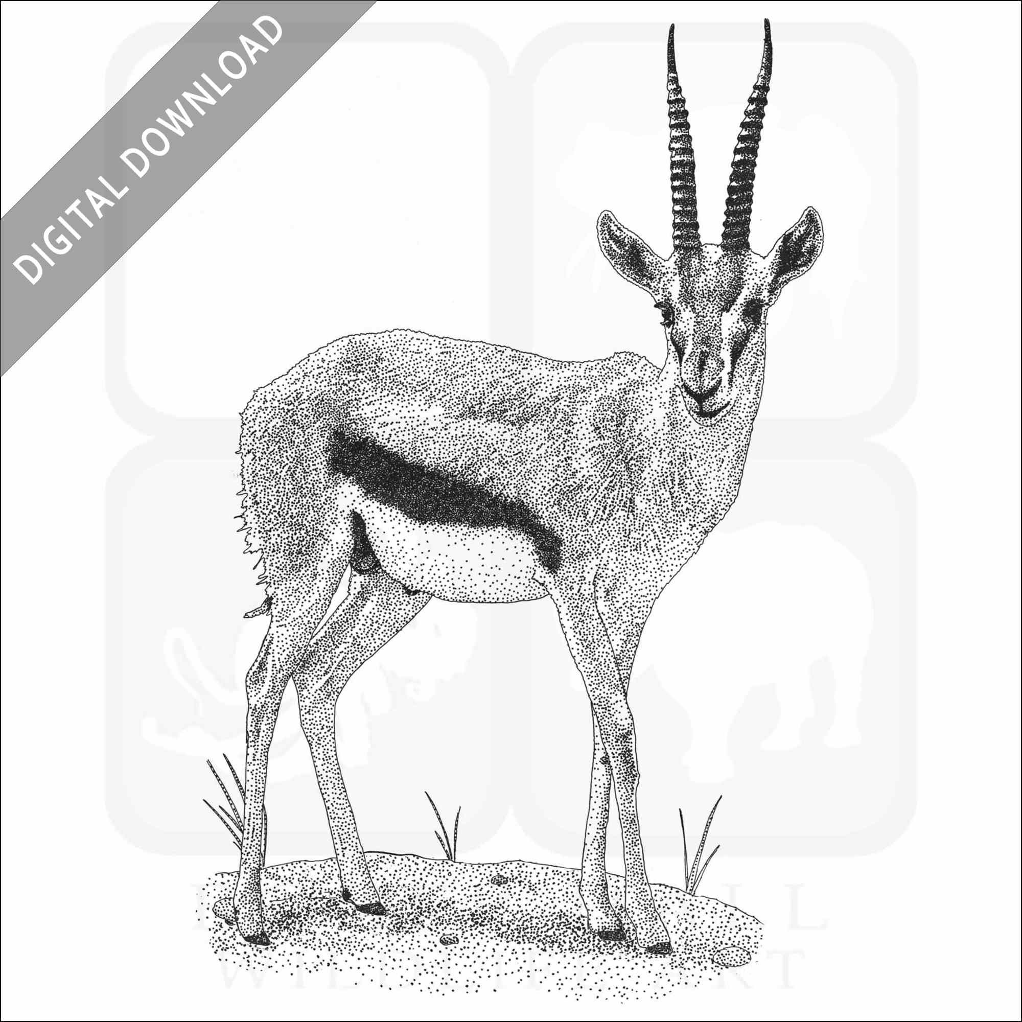 Stock art illustration of a Thompson’s Gazelle (Eudorcas thomsonii.)Â The illustration is available in black and white or color for immediate download.