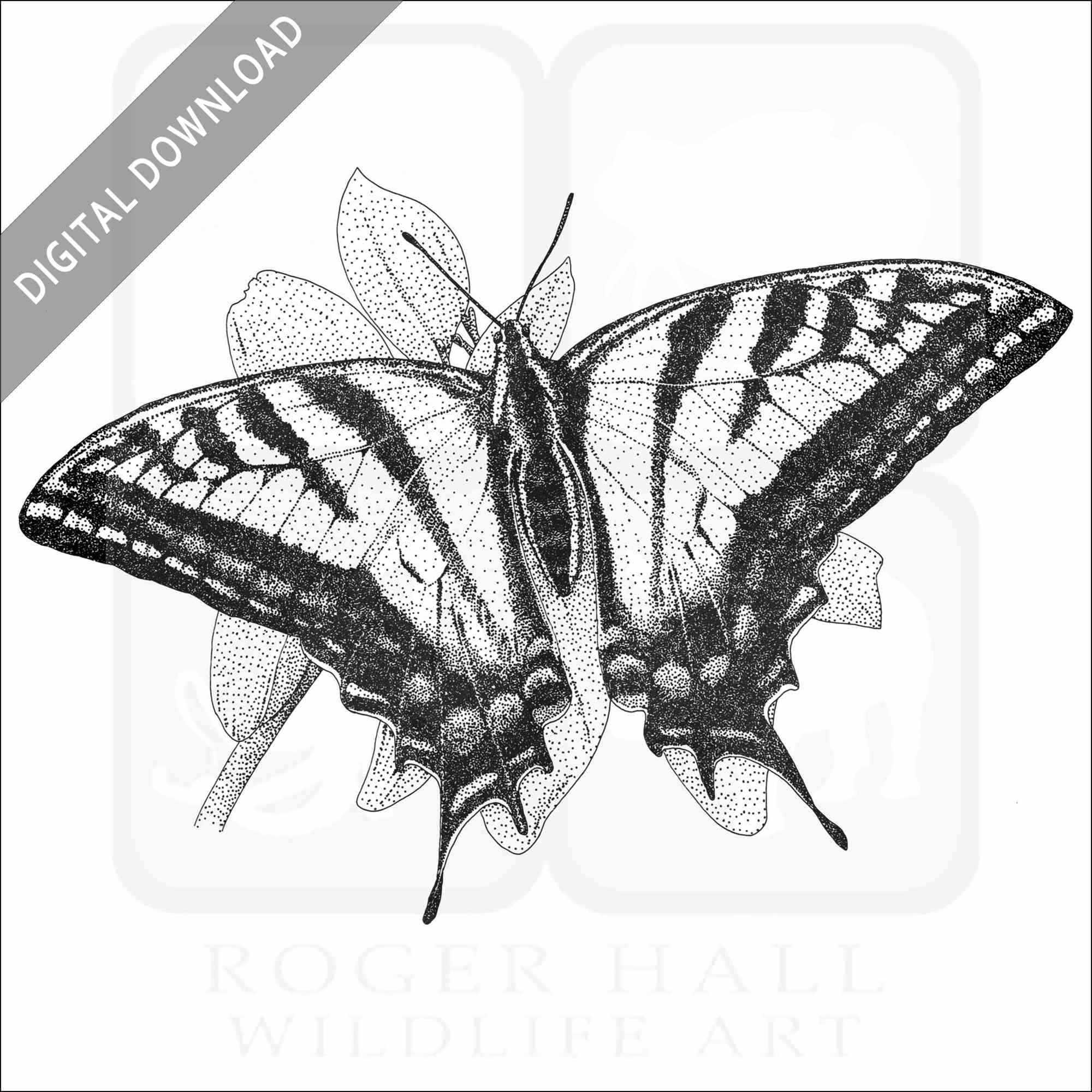 Stock art illustration of a Two-Tailed Swallowtail Butterfly (Papilio multicaudata.) The illustration is available in two-tailed and white or color for immediate download.