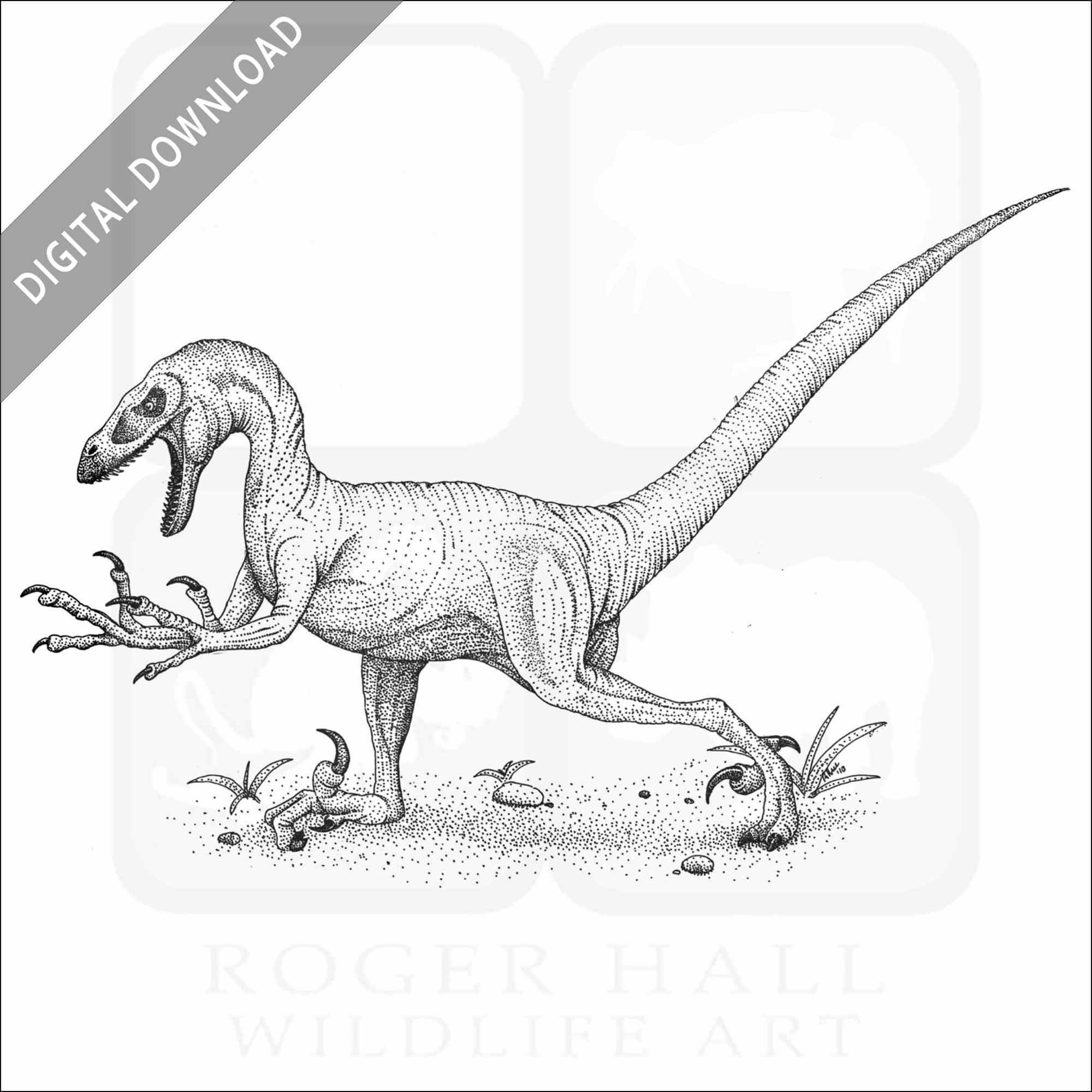 Stock art illustration of a Velociraptor (Velociraptor antirrhopus.) The illustration is available in black and white or color for immediate download.