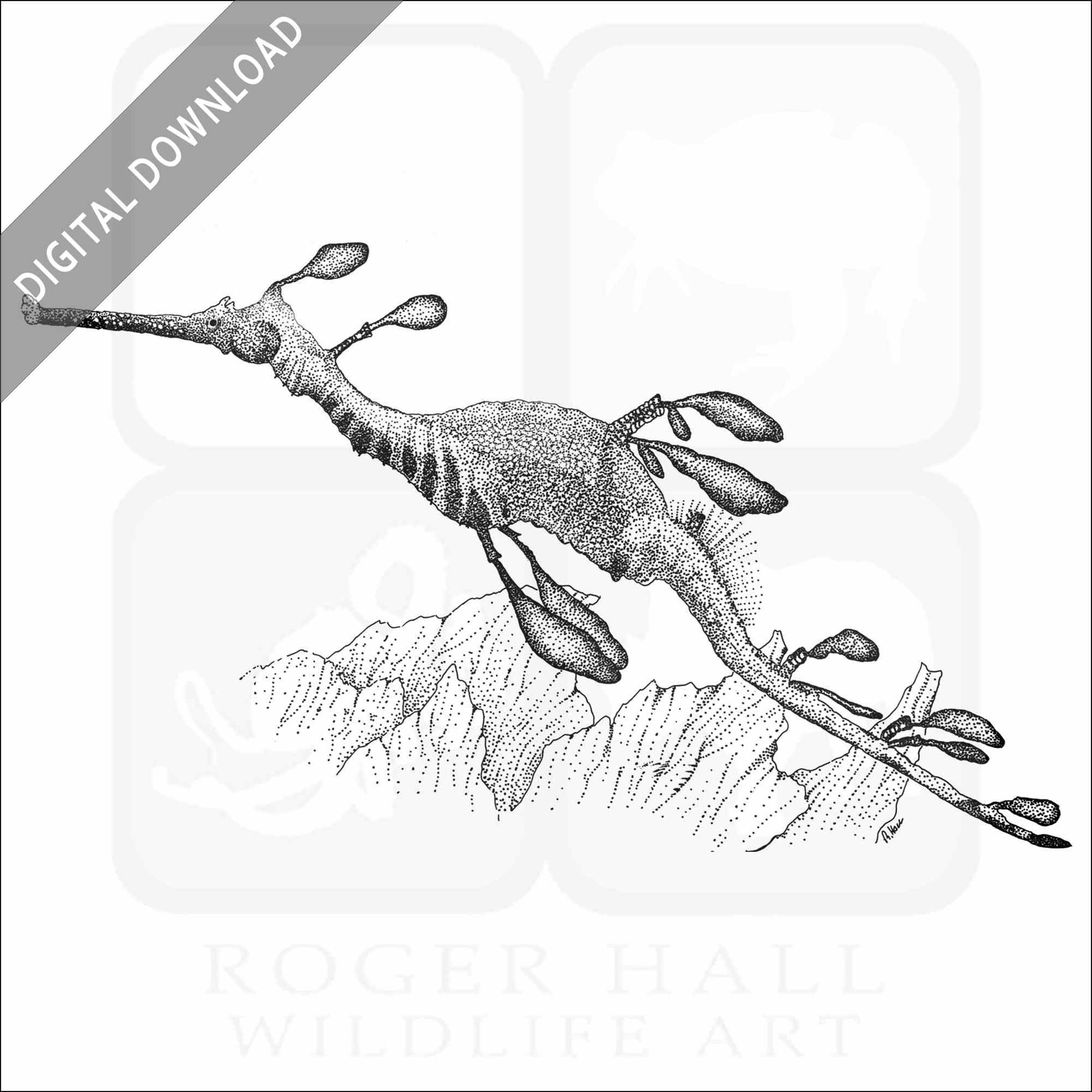 Stock art illustration of a Weedy Sea Dragon (Phyllopteryx taeniolatus.) The illustration is available in black and white or color for immediate download.