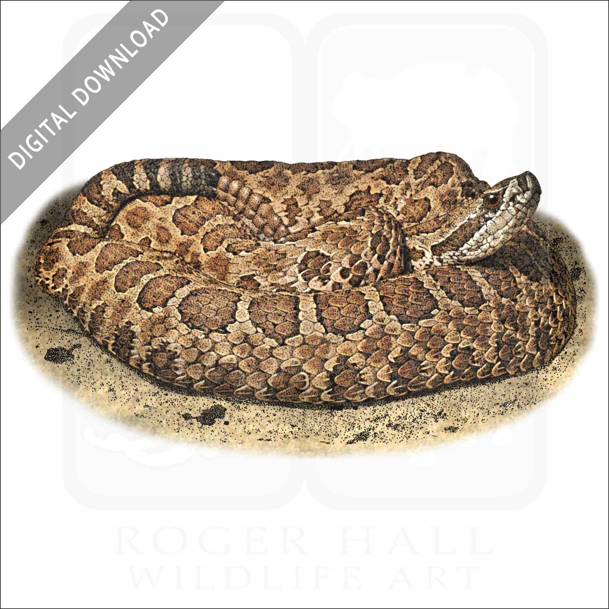Stock art illustration of a Western Massasauga (Sistrurus catenatus tergeminus.) The illustration is available in black and white or color for immediate download.