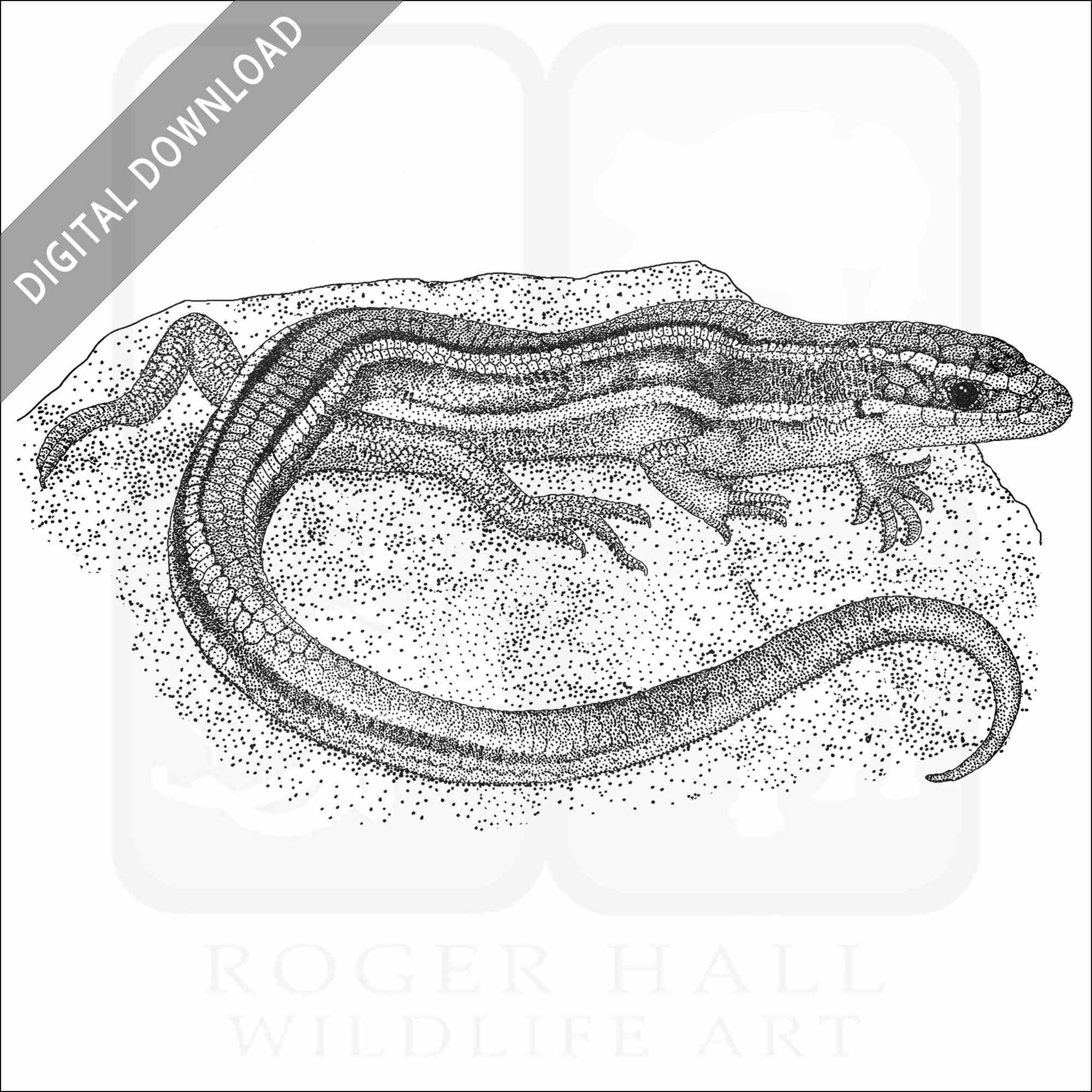 Stock art illustration of a Western Skink (Plestiodon skiltonianus.) The illustration is available in black and white or color for immediate download.
