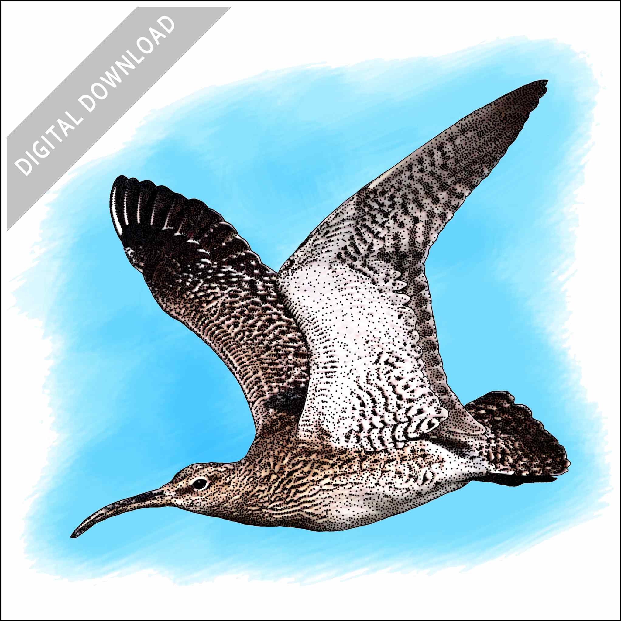 Stock art illustration of a Whimbrel (Numenius phaeopus.) The illustration is available in black and white or color for immediate download.