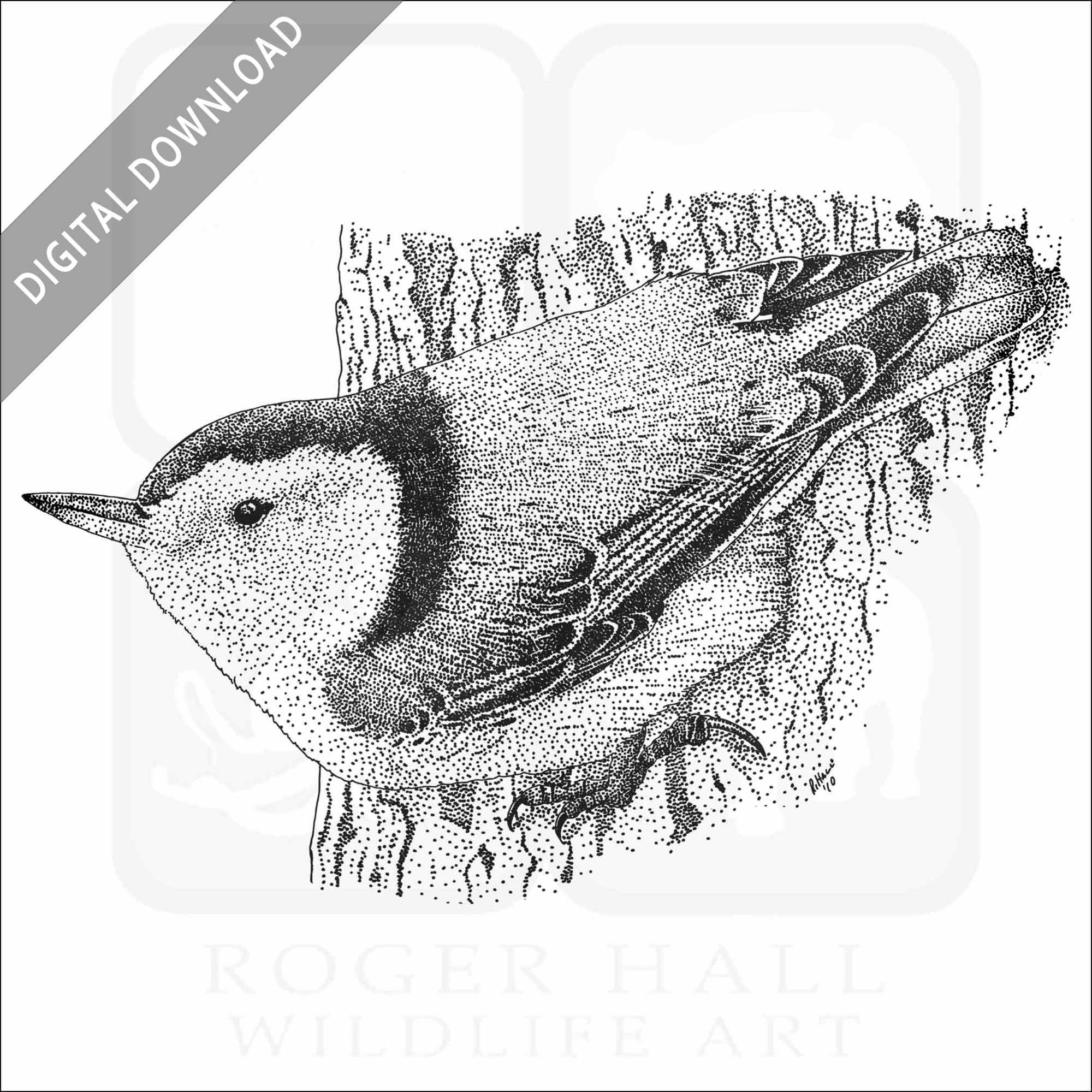 Stock art illustration of a White-Breasted Nuthatch (Sitta carolinensis.)Â The illustration is available in black and white or color for immediate download.