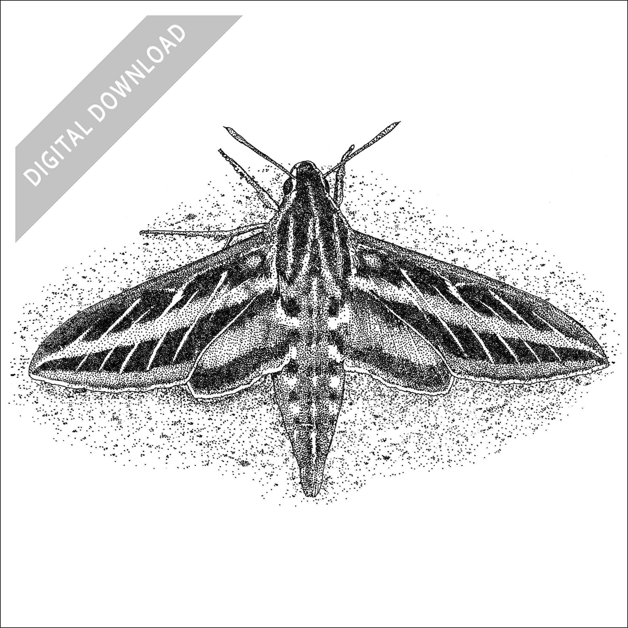 Stock art illustration of a White-Lined Sphinx Moth (Hyles lineata.)Â The illustration is available in black and white or color for immediate download.