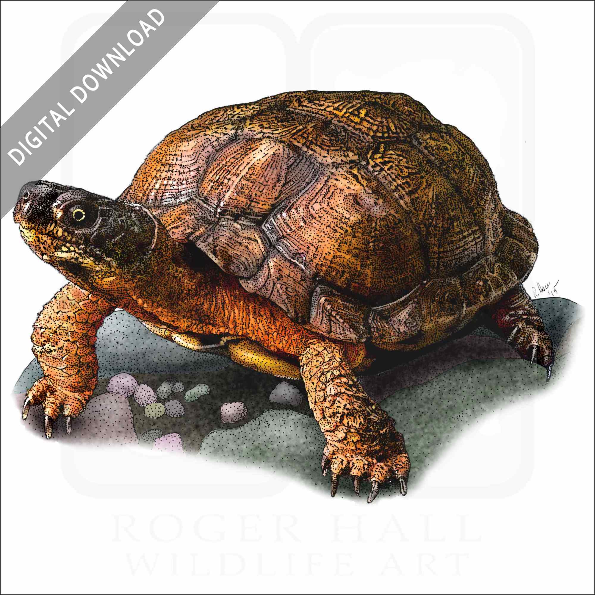Stock art illustration of a Wood Turtle (Glyptemys insculpta.) The illustration is available in black and white or color for immediate download.
