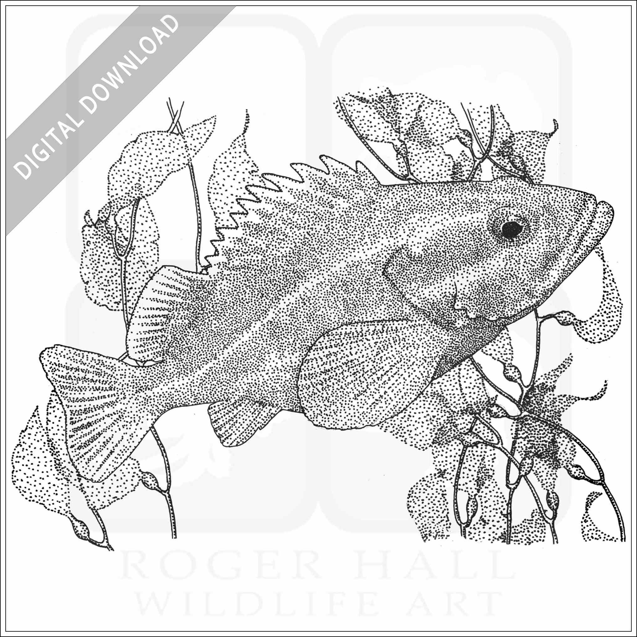 Stock art illustration of a Yelloweye Rockfish (Sebastes ruberrimus.)Â The illustration is available in black and white or color for immediate download.