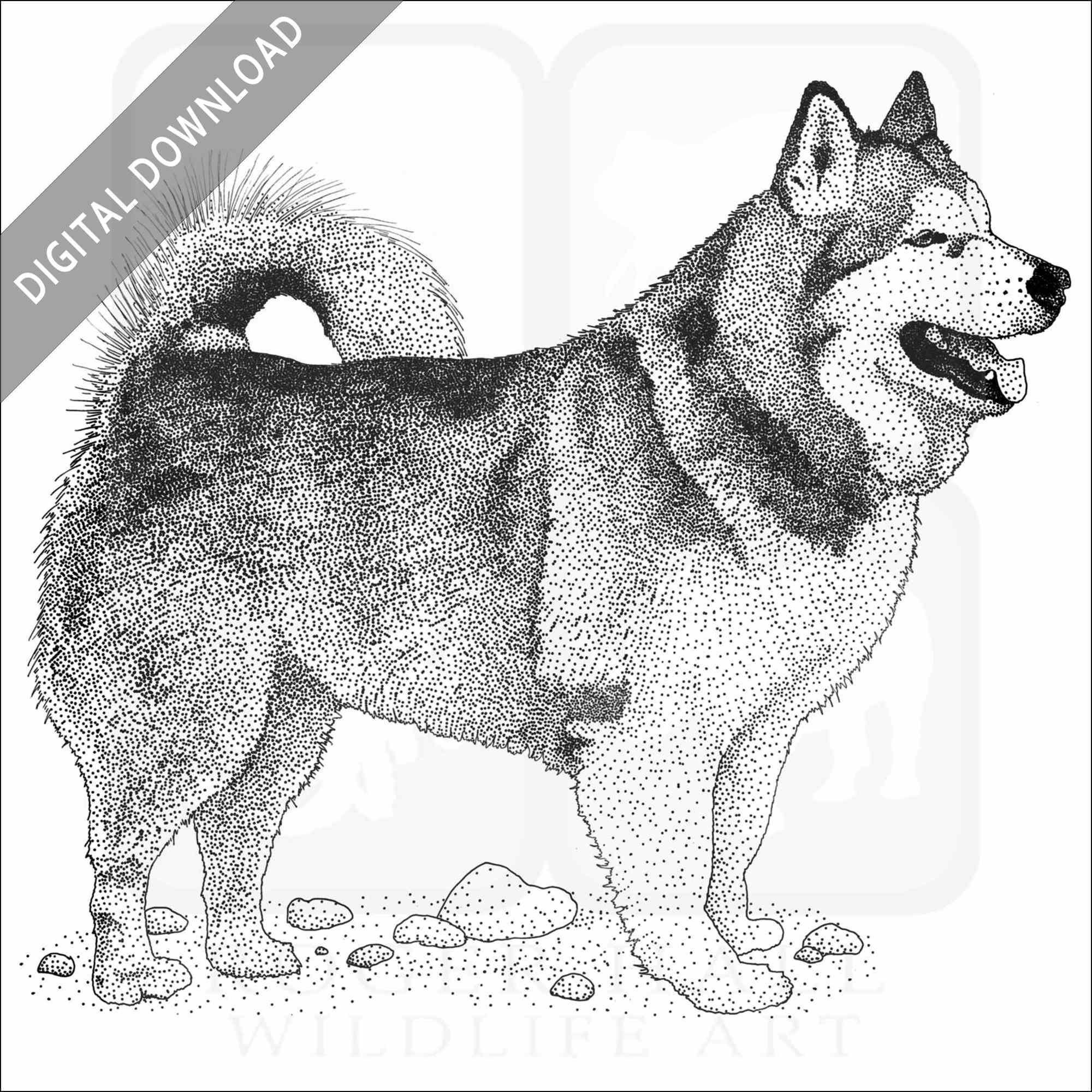 Stock art illustration of an Alaskan Malamute (Canis lupus familiaris.) The illustration is available in black and white or color for immediate download.