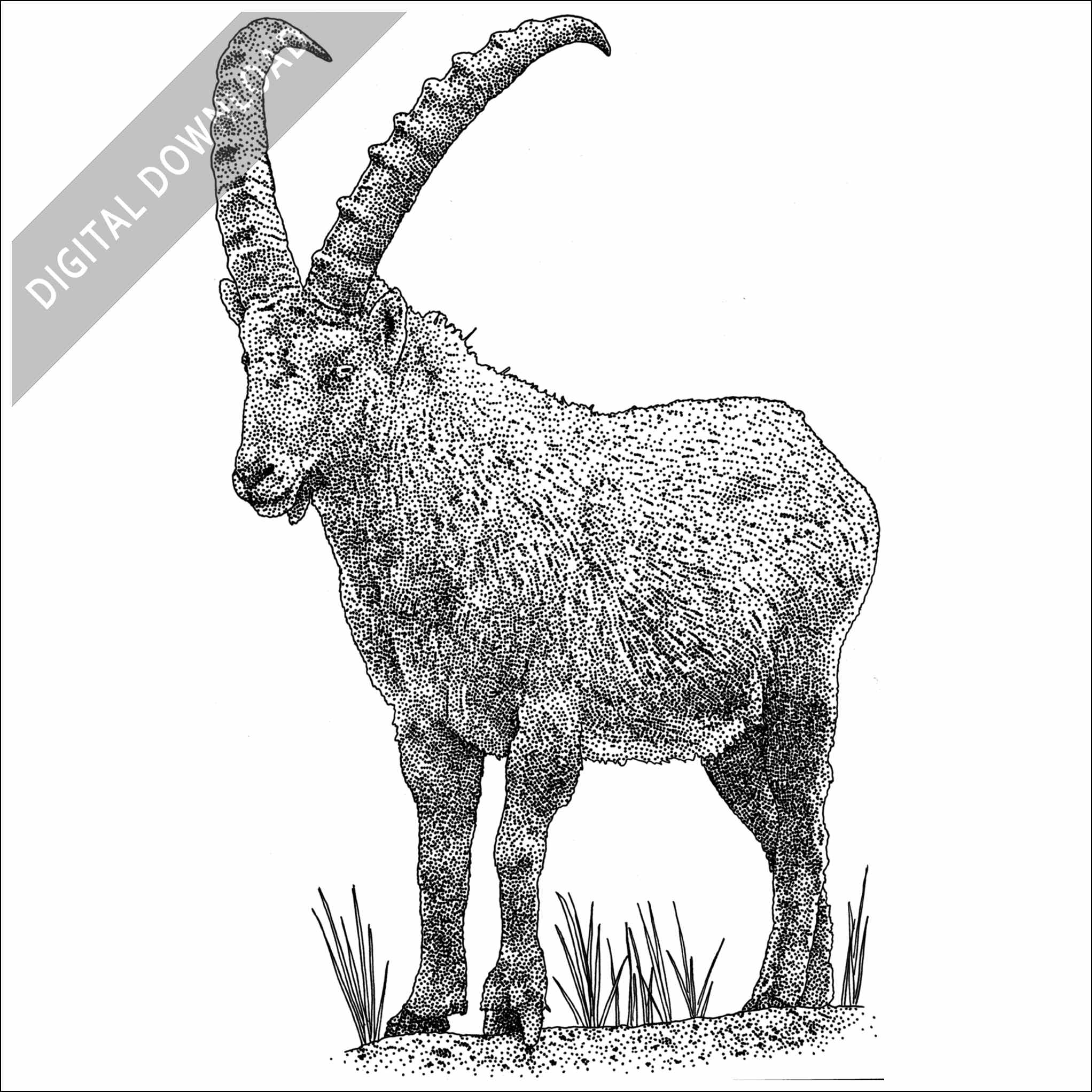 Stock art illustration of an Alpine Ibex (Capra ibex.)Â The illustration is available in black and white or color for immediate download.