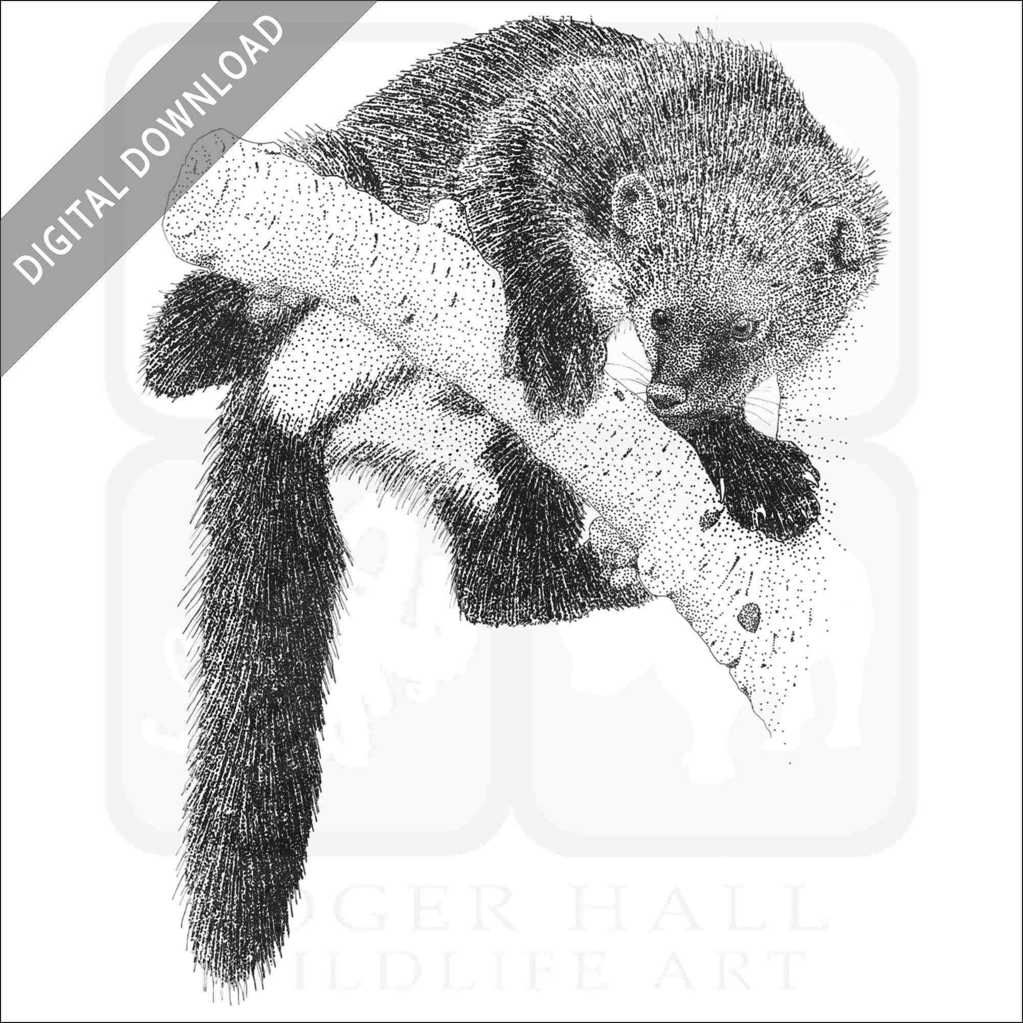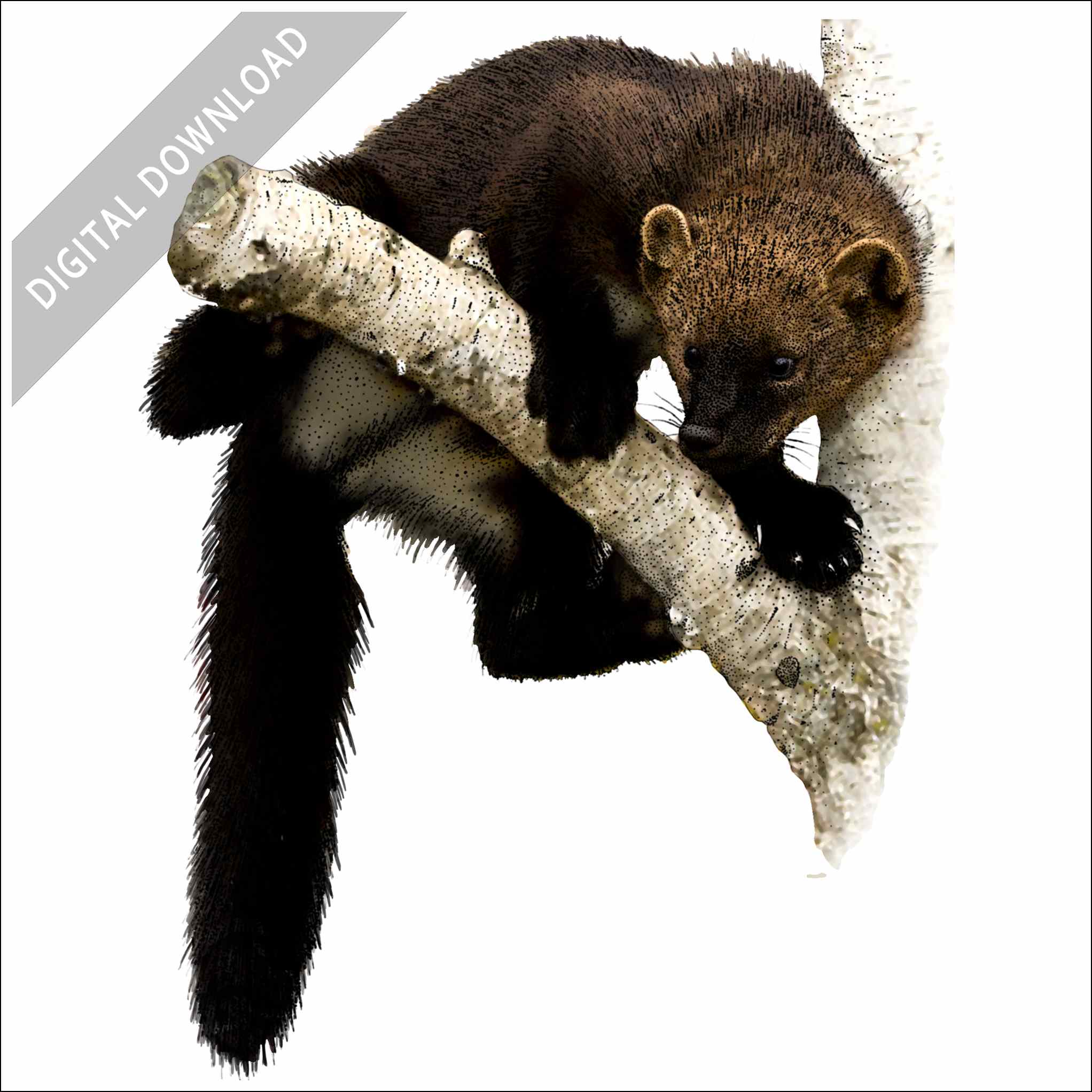 Stock art illustration of an American Fisher (Martes americana.) The illustration is available in black and white or color for immediate download.