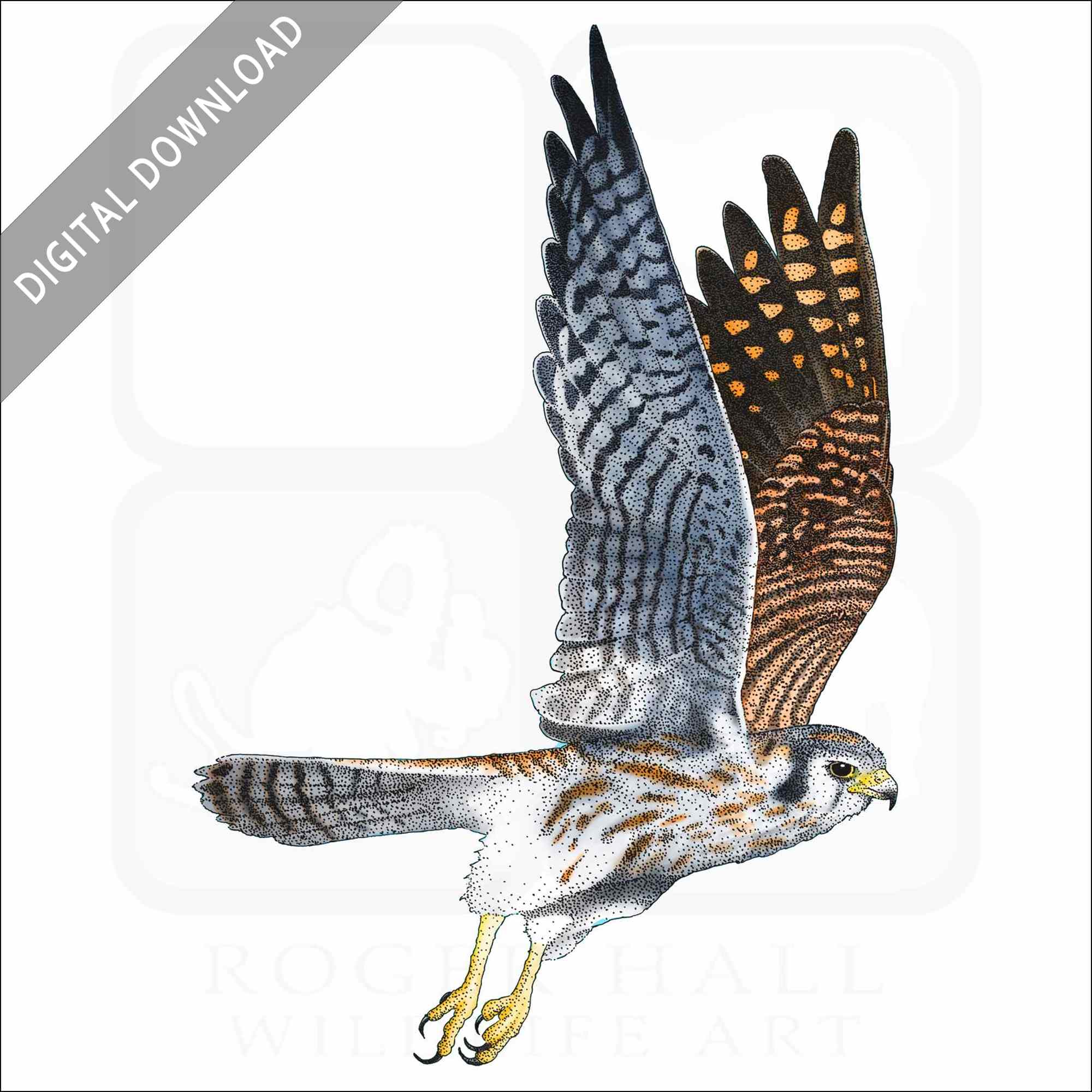 Stock art illustration of an American Kestrel (Falco sparverius.) The illustration is available in black and white or color for immediate download