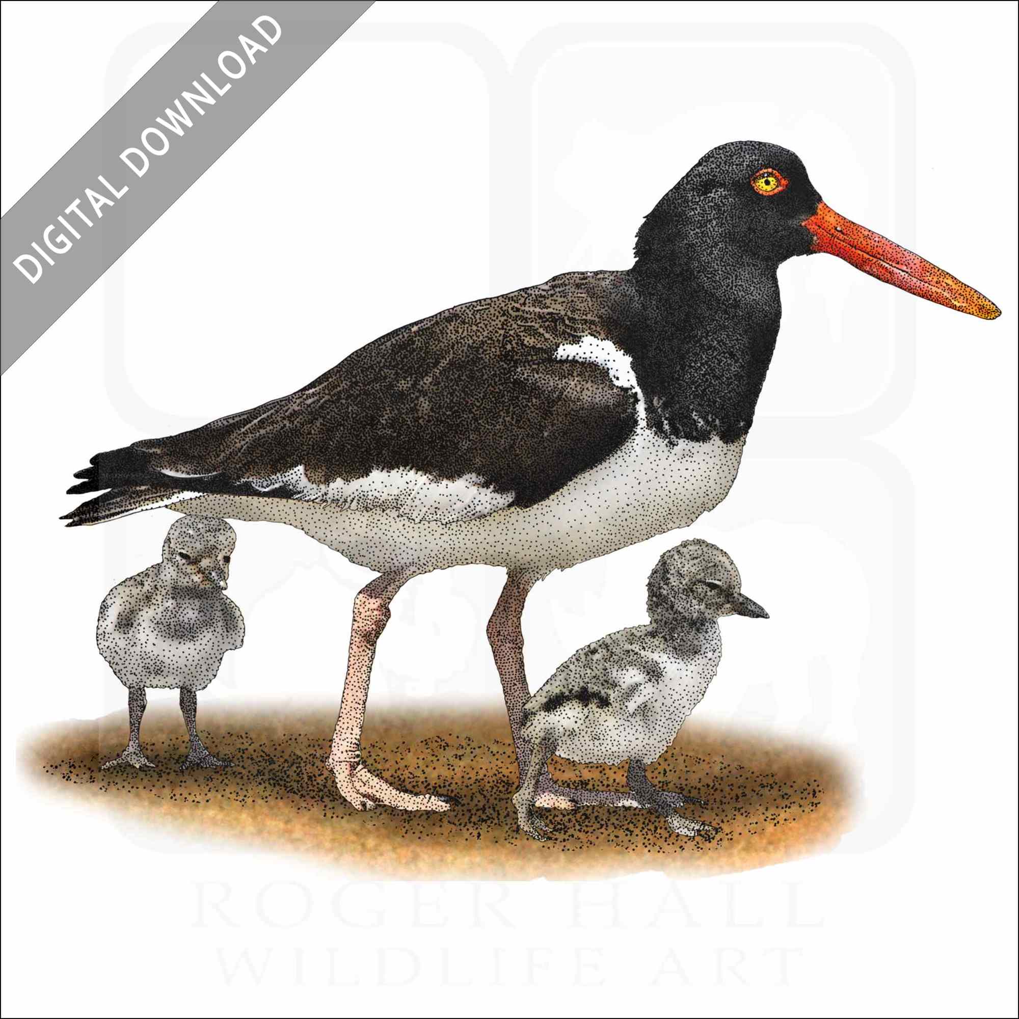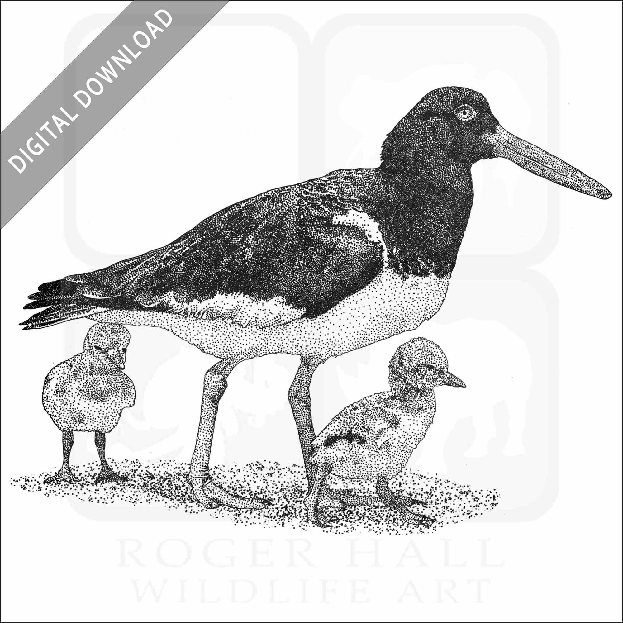 Stock art illustration of an American Oystercatcher (Haematopus palliatus.) The illustration is available in black and white or color for immediate download.