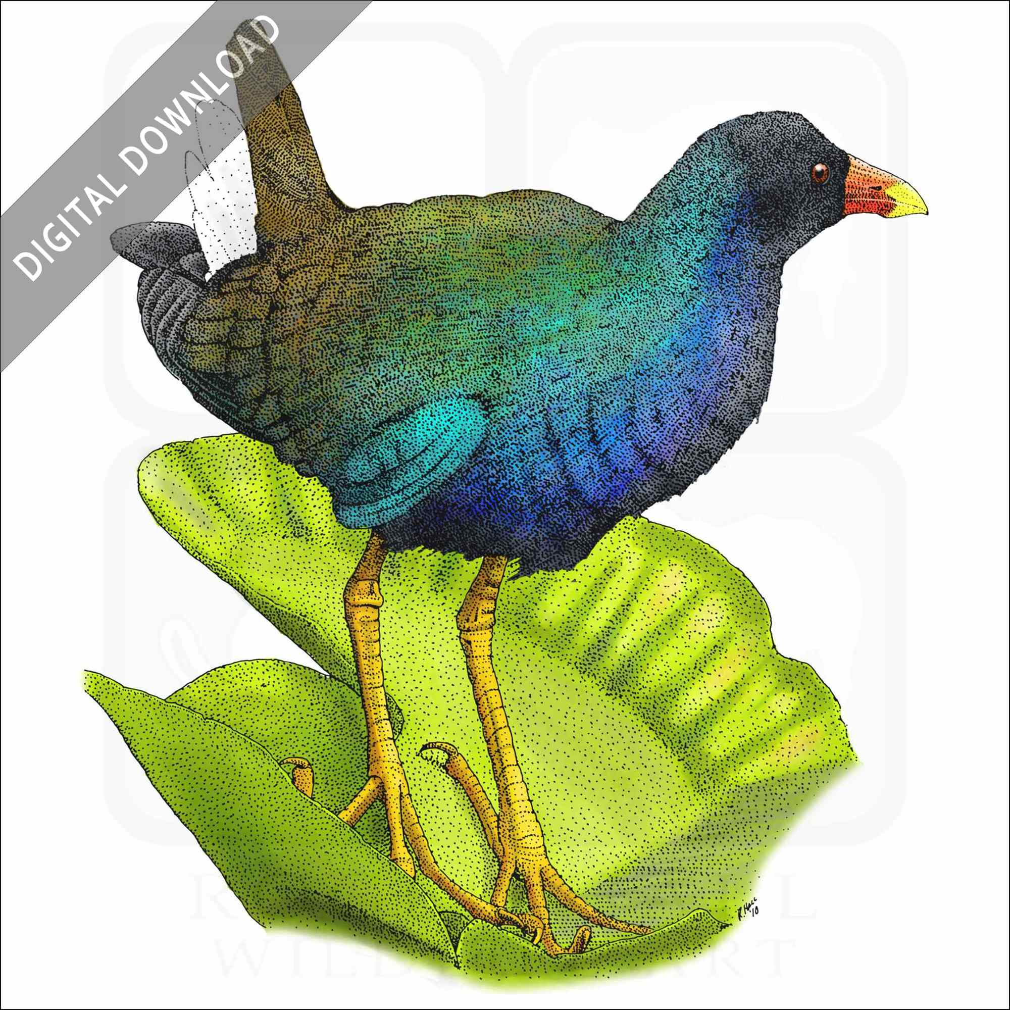 Stock art illustration of an American Purple Gallinule (Porphyrio martinica.)Â The illustration is available in black and white or color for immediate download.